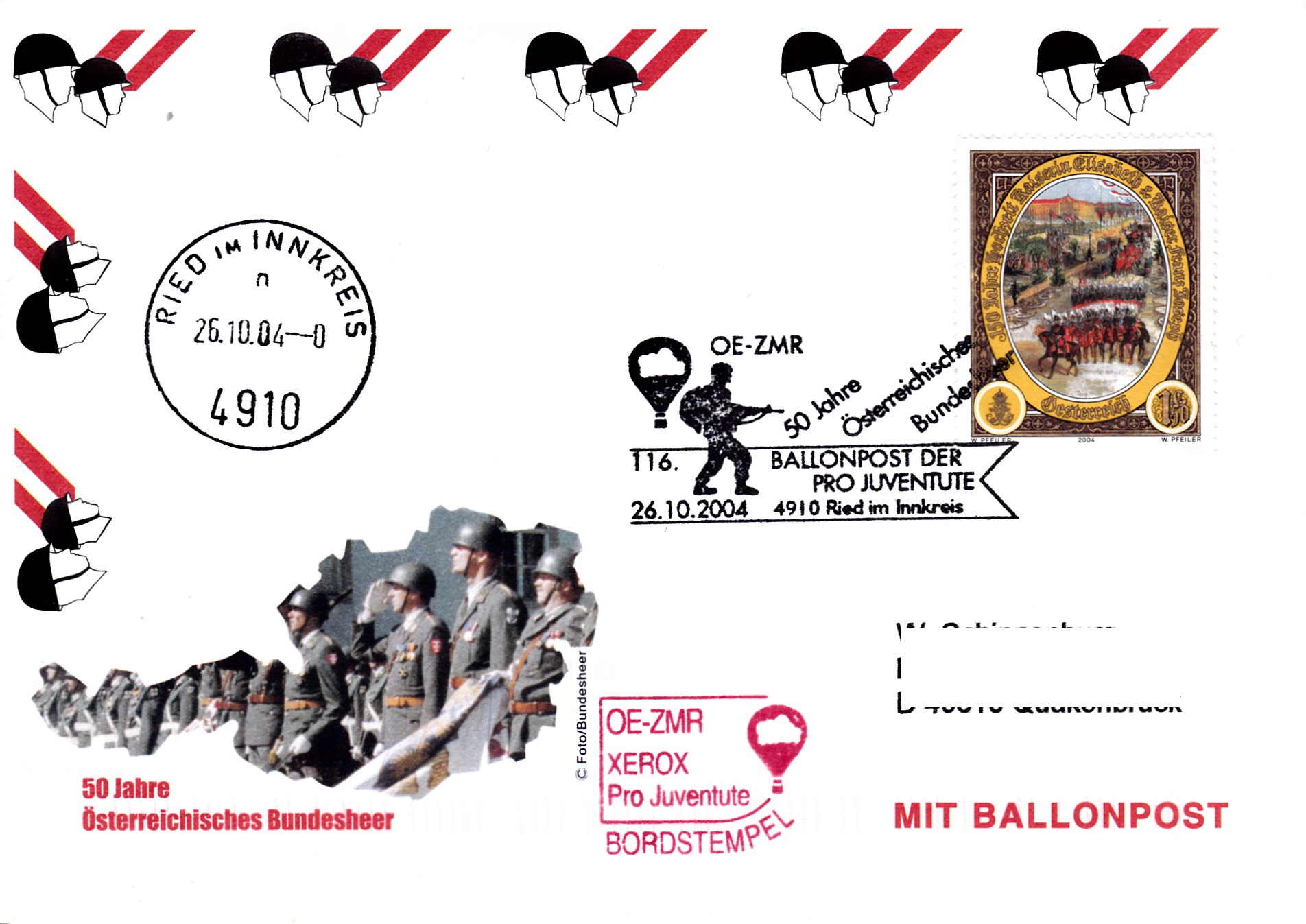 Dieser Umschlag wurde am 26.10.2004 in Ried im Innkreis für den 116. Ballonpostflug der Österreichischen Pro Juventute mit dem Freiballon OE-ZMR aufgegeben. Er erhielt den Sonderstempel aus Ried im Innkreis zu diesem Ballonflug und wurde am gleichen Tag mit dem Freiballon OE-ZMR befördert. Er erhielt zusätzlich einen Tagesstempel Ried im Innkreis und einen Bordstempel.