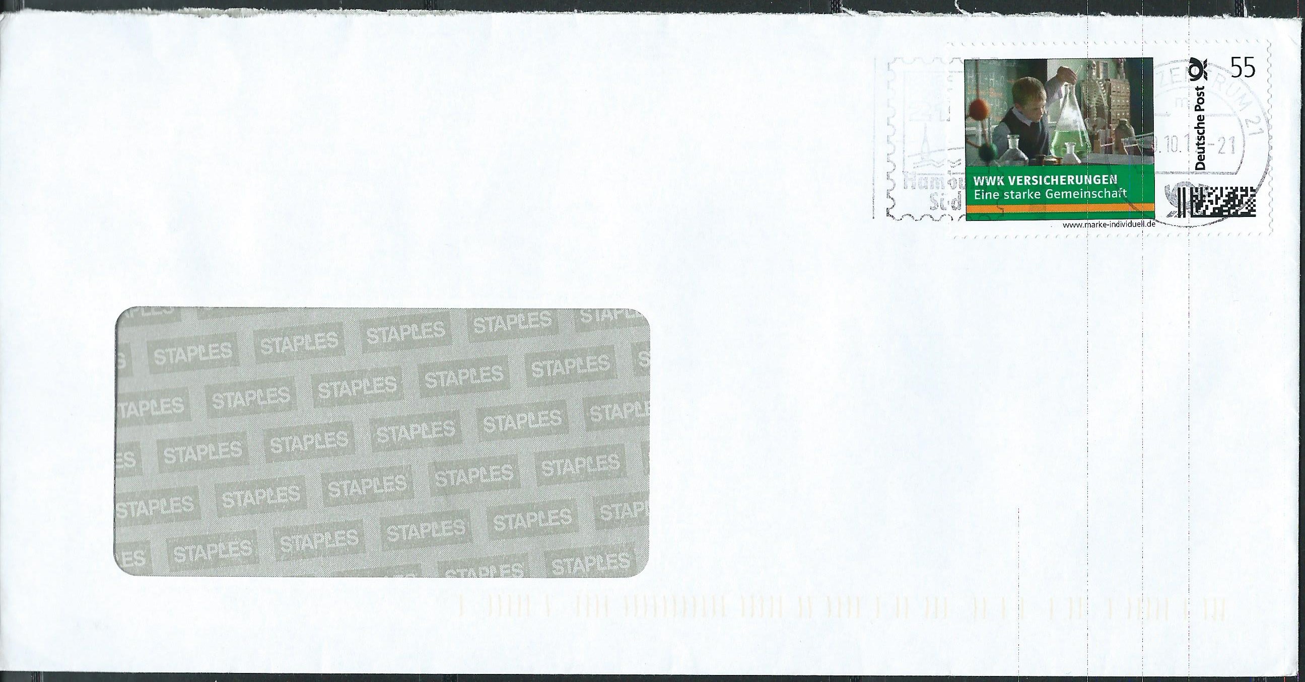 Mir sind heute noch 2 neue Belege in die Hände gefallen, die hier gleich gezeigt werden sollen. Zum einen ist es die Wertstufe 55 ct auf einem Standart-Brief mit einem Motiv der WWK-Verischerungen. Abgestempelt wurde er im Briefzentrum 21 am 30.10.11.