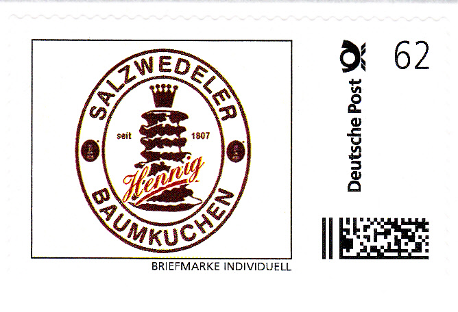 Auf dieser Briefmarke Individuell sehen wir ein Logo der Firma "Hennig", der ersten Baumkuchenfabrik in Salzwedel, mit der Abbildung eines Baumkuchens. Die Marke gibt es auch mit anderen Wertstufen für Standardbriefe der vorangegangenen Portozeiträume.