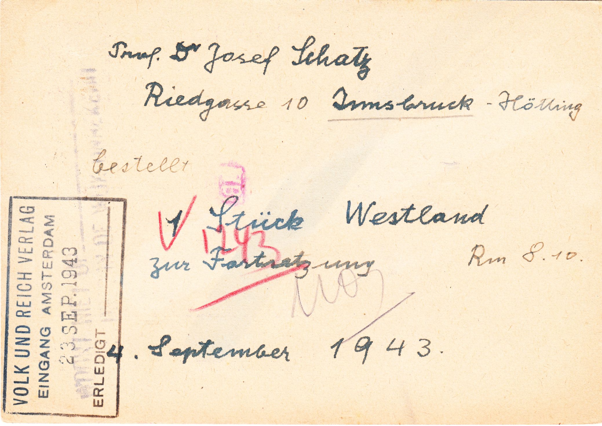 Der Beleg durchlief in Den Haag zur Eingangssortierung die TRANSORMA, worauf ein Operatorstempel "UU" hinweist: