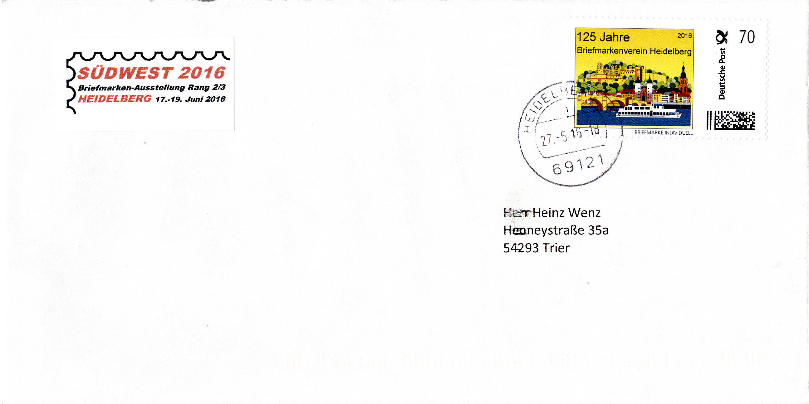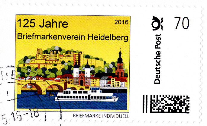 Marke individuell zu 70 Cent zum Jubiläum "125 Jahre Briefmarkenverein Heidelberg" mit Ansicht von Heidelberg mit Neckar, Brücke und Schloss.