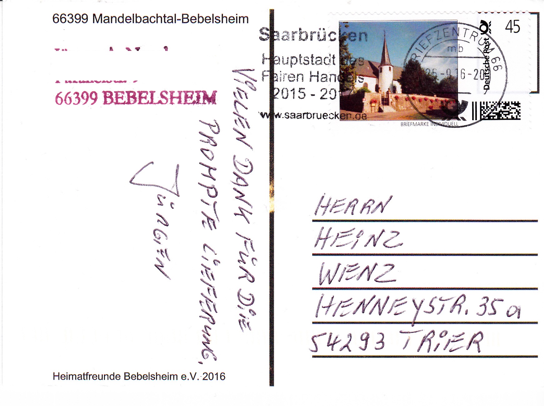 Die Marke individuell der Heimatfreunde Bebelsheim mit Abbildung der Pfarrkirche in Mandelbachtal-Bebelsheim wurde bereits als 60 Cent-Marke gezeigt. Hier nun ein bildgleiche Marke zu 45 Cent auf einer Postkarte verwendet.
