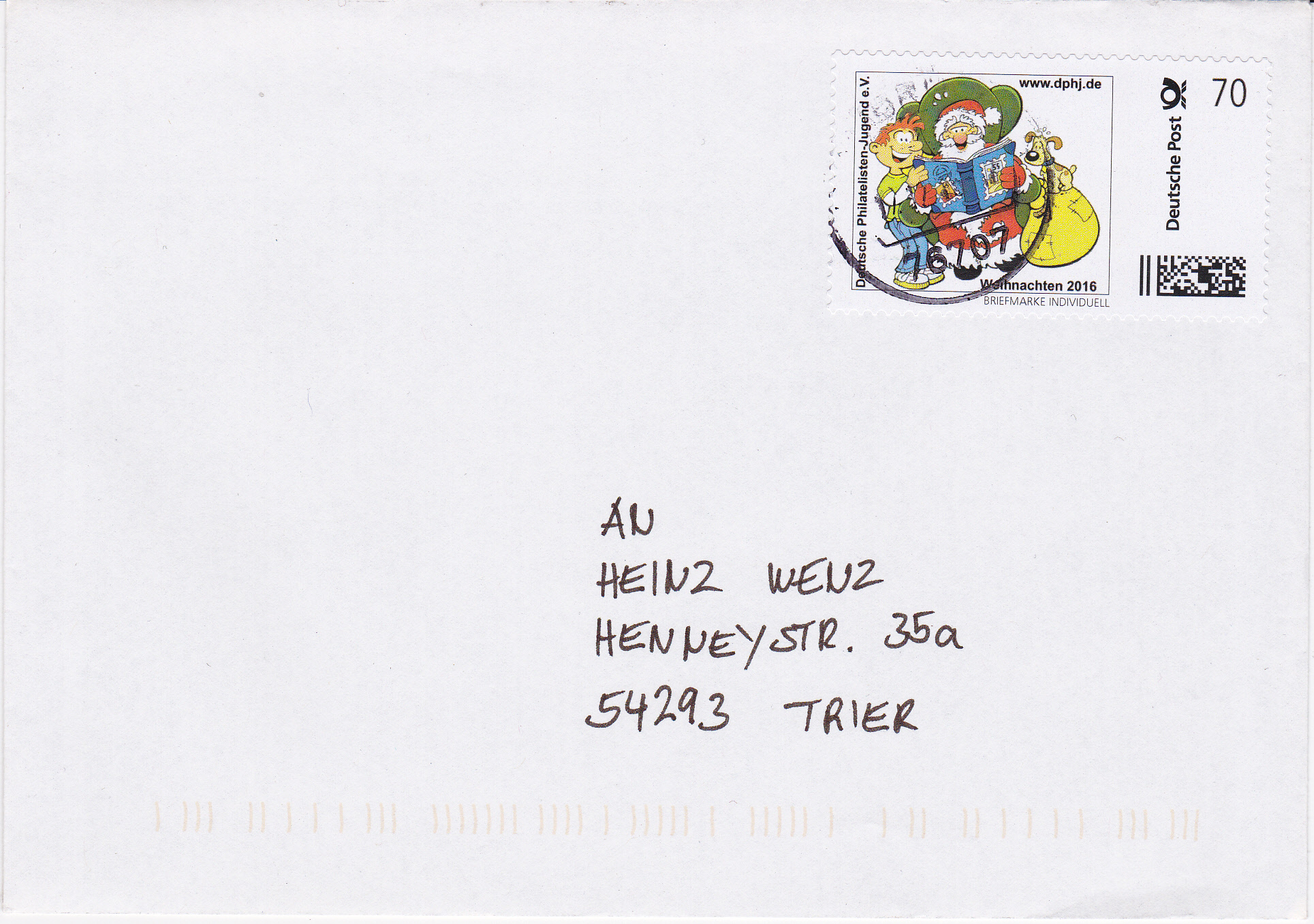 Auf diesem Brief wurde eine der Weihnachtsmarken der DPhJ e.V. als Porto verklebt. Leider ist der Stempelabschlag nicht gerade gut.