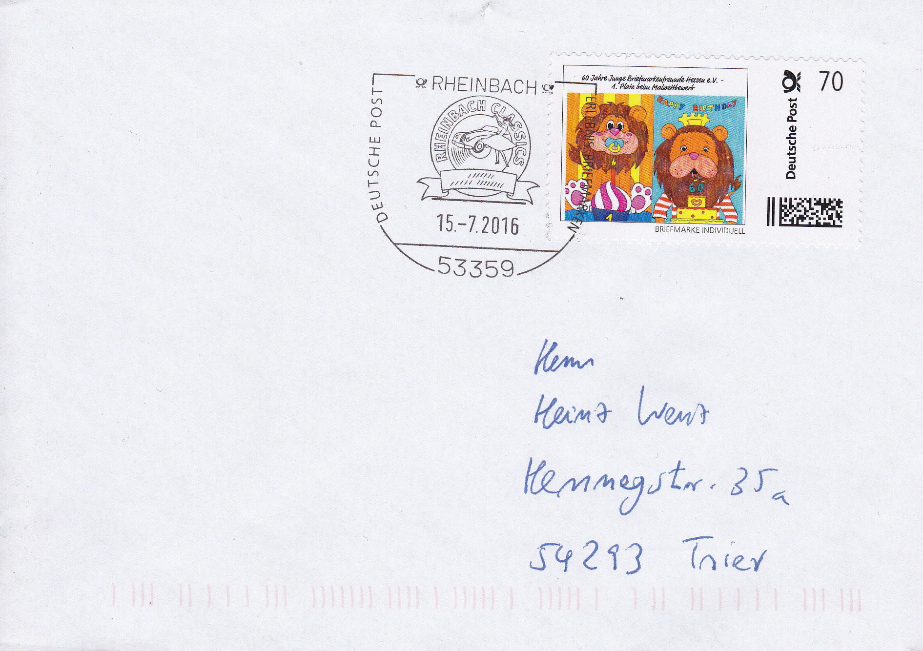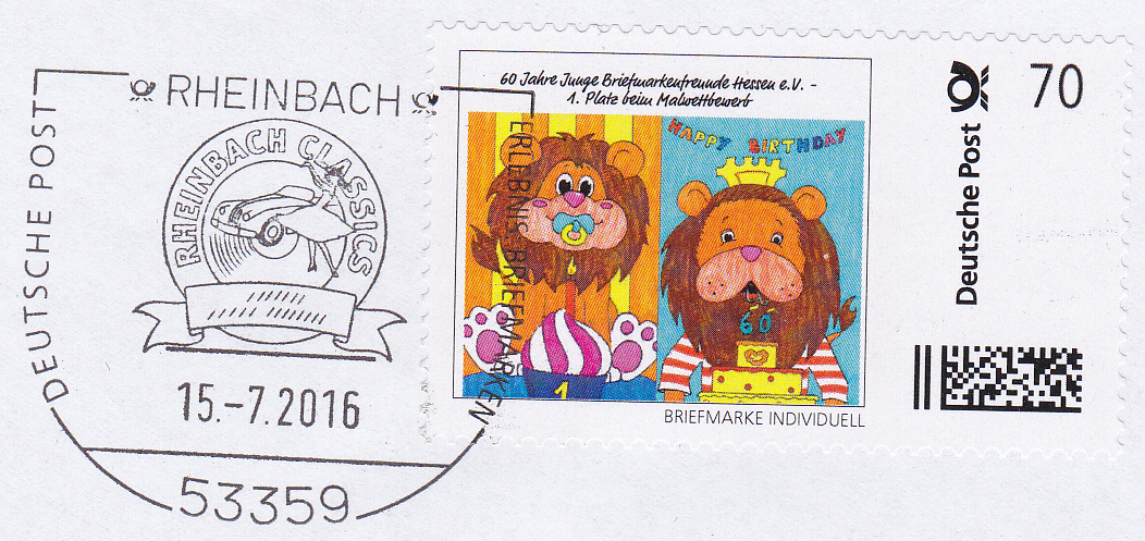 Diese Marke individuell wurde zum Jubiläum "60 Jahre Junge Briefmarkenfreunde Hessen e.V." hergestellt. Die Marke wurde von der Deutschen Post AG doppelt entwertet.