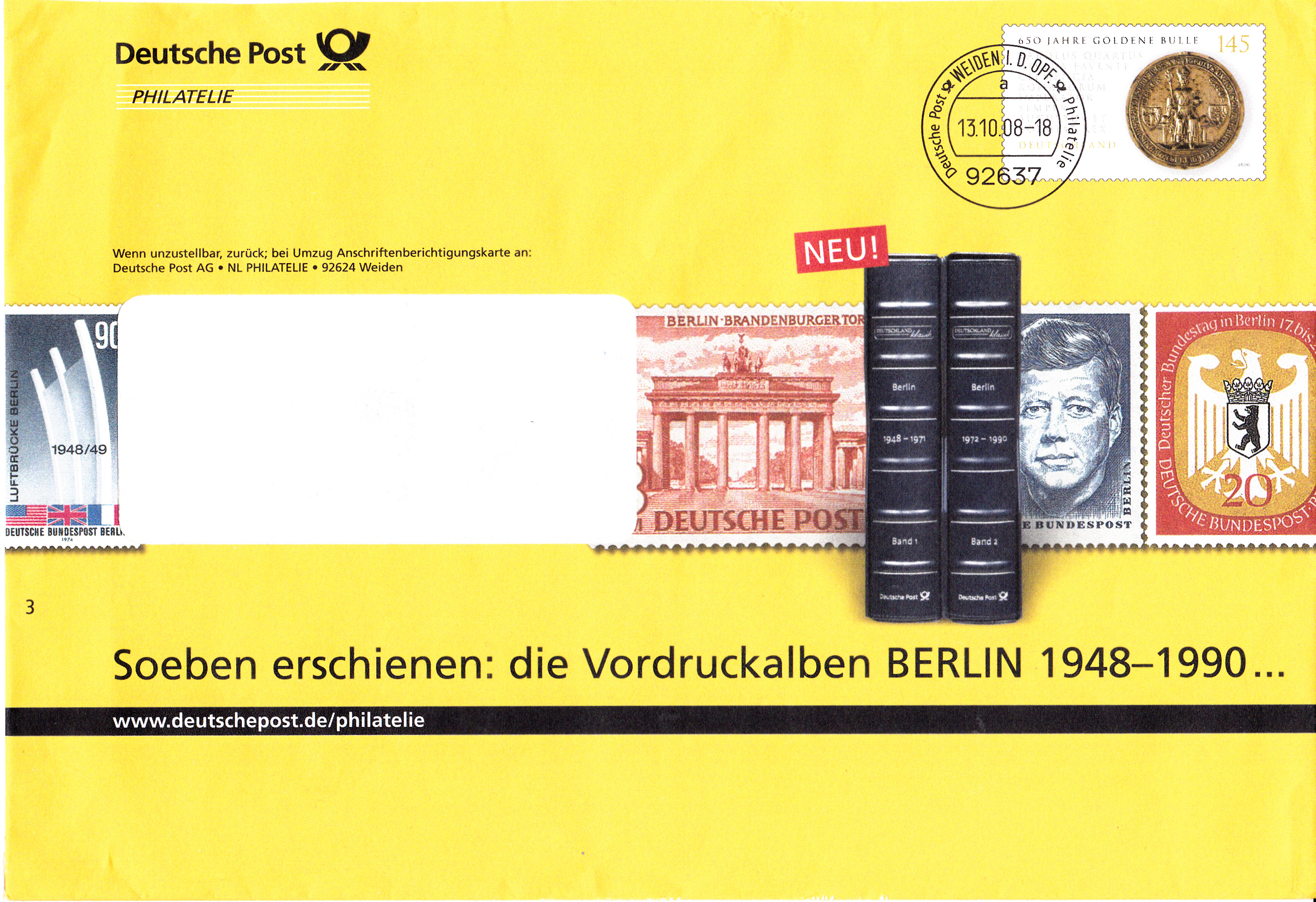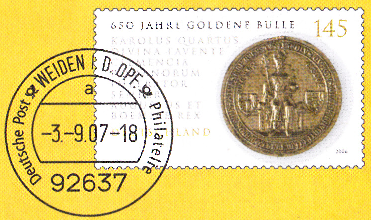 Dieser Ganzsachenumschlag im Format 229 x 324 mm hat einen Wertstempel mit der Marke zu 145 Cent zum Jubiläum "175 Jahre Hambacher Fest" (MiNr 2603). Die Vorausentwertung hat das Datum "20.10.08-18". Der Umschlag ist unter der MiNr EA F372 katalogisiert. Der Scan erfasst nicht den gesamten Umschlag, da zu groß für die DIN A4 Scan-Fläche.