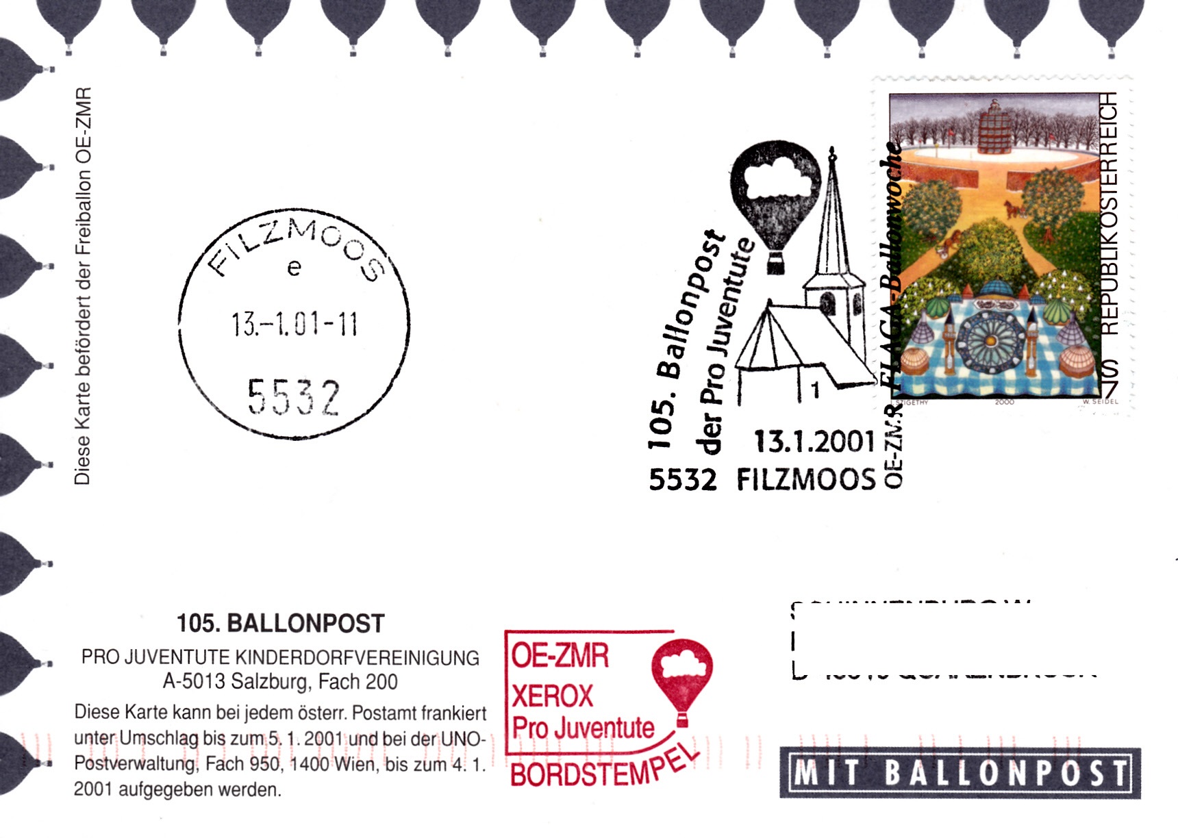 Diese Karte wurde am 13.1.2001 in Filzmoos für den 105. Ballonpostflug der Österreichischen Pro Juventute mit dem Freiballon OE-ZMR aufgegeben. Sie erhielt den Sonderstempel aus Filzmoos zu diesem Ballonflug und wurde am gleichen Tag mit dem Freiballon OE-ZMR befördert. Sie erhielt zusätzlich einen Tagesstempel Filzmoos und einen Bordstempel.