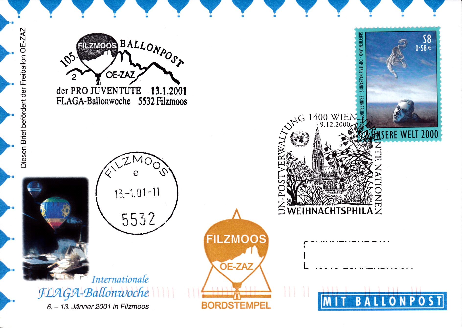 Dieser Umschlag wurde am 9.12.2000 für den 105. Ballonpostflug der Österreichischen Pro Juventute mit dem Freiballon OE-ZAZ in Wien beim UNO-Postamt aufgegeben. Die zur Frankatur verwendeten Marken der UNO-Postverwaltung Wien wurden mit einem Sonderstempel Wien - Vereinte Nationen gestempelt. Am 13.1.2001 erhielt die Karte den Sonderstempel aus Filzmoos mit der Kennziffer "2" zu diesem 105. Ballonpostflug. Zusätzlich wurde ein Tagesstempel aus Filzmoos und ein Bordstempel auf der Karte angebracht.