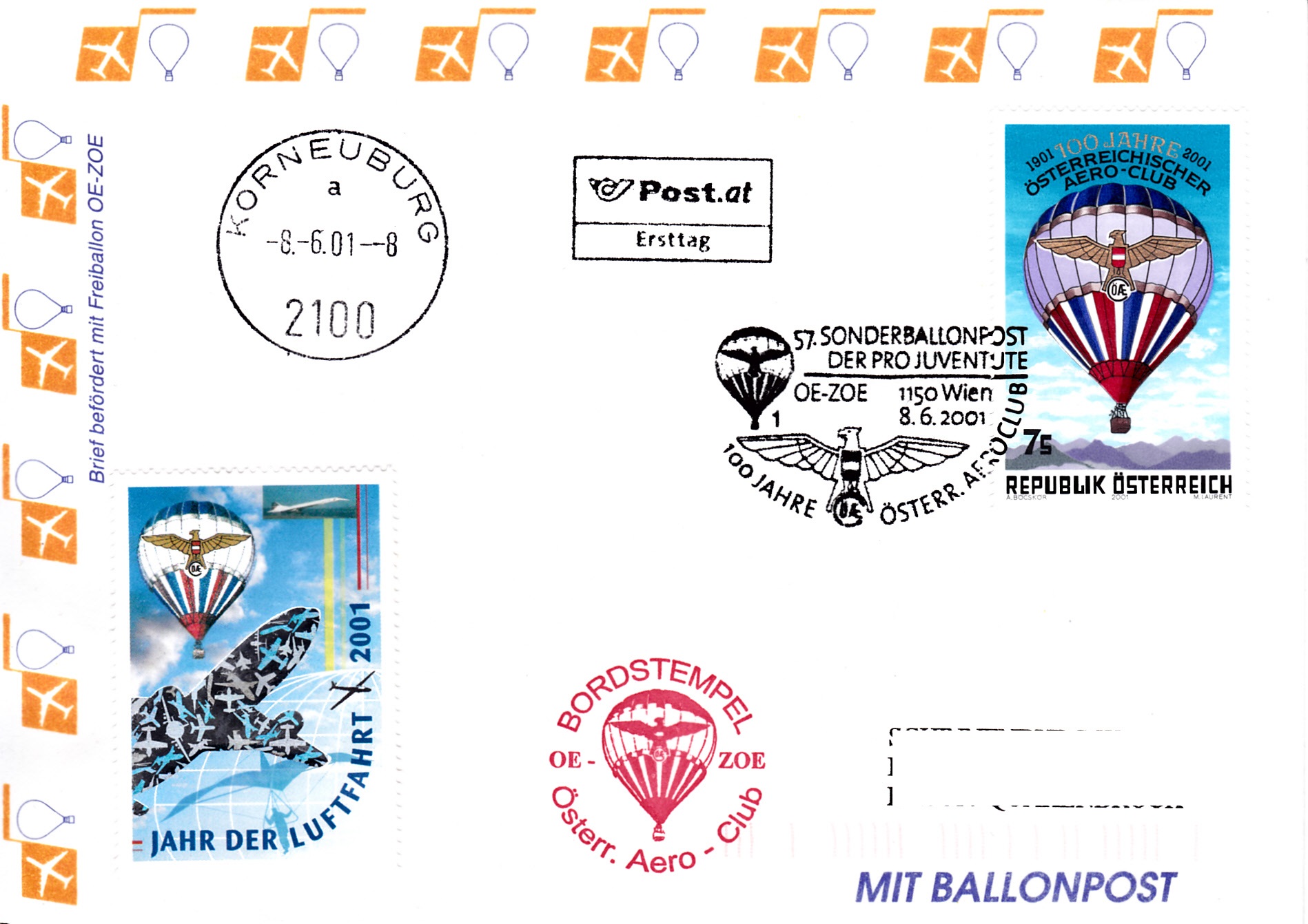 Dieser Brief wurde am 8.6.2001 in Wien für den 57. Sonder-Ballonpostflug der Österreichischen Pro Juventute mit dem Freiballon OE-ZOE aufgegeben. Er erhielt den Sonderstempel mit der Kennziffer "1" aus Wien zu diesem Ballonflug und wurde am gleichen Tag mit dem Freiballon OE-ZOE befördert. Der Brief erhielt noch einen Zusatzstempel "Ersttag", einen Tagesstempel Korneuburg und einen Bordstempel.