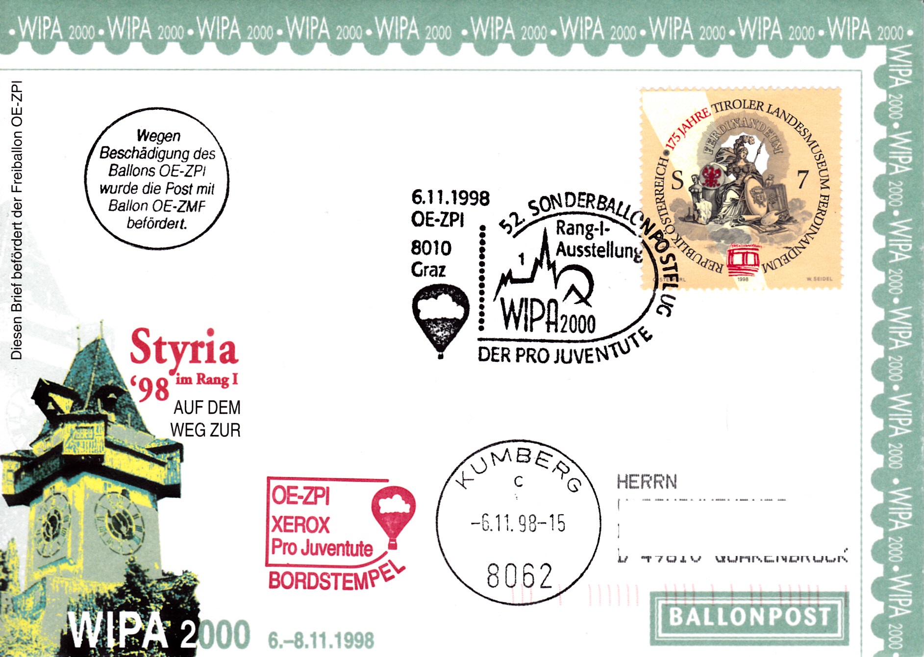 Dieser Brief wurde am 6.11.1998 in Graz für den 52. Sonder-Ballonpostflug der Österreichischen Pro Juventute mit dem Freiballon OE-ZPI aufgegeben. Er erhielt den Sonderstempel mit der Kennziffer "1" aus Graz zu diesem Ballonflug und wurde am gleichen Tag mit dem Freiballon OE-ZMF befördert, da der Ballon OE-ZPI beschädigt war. Der Brief erhielt noch einen Zusatzstempel "Wegen Beschädigung...", einen Tagesstempel Kumberg und einen Bordstempel OE-ZPI.