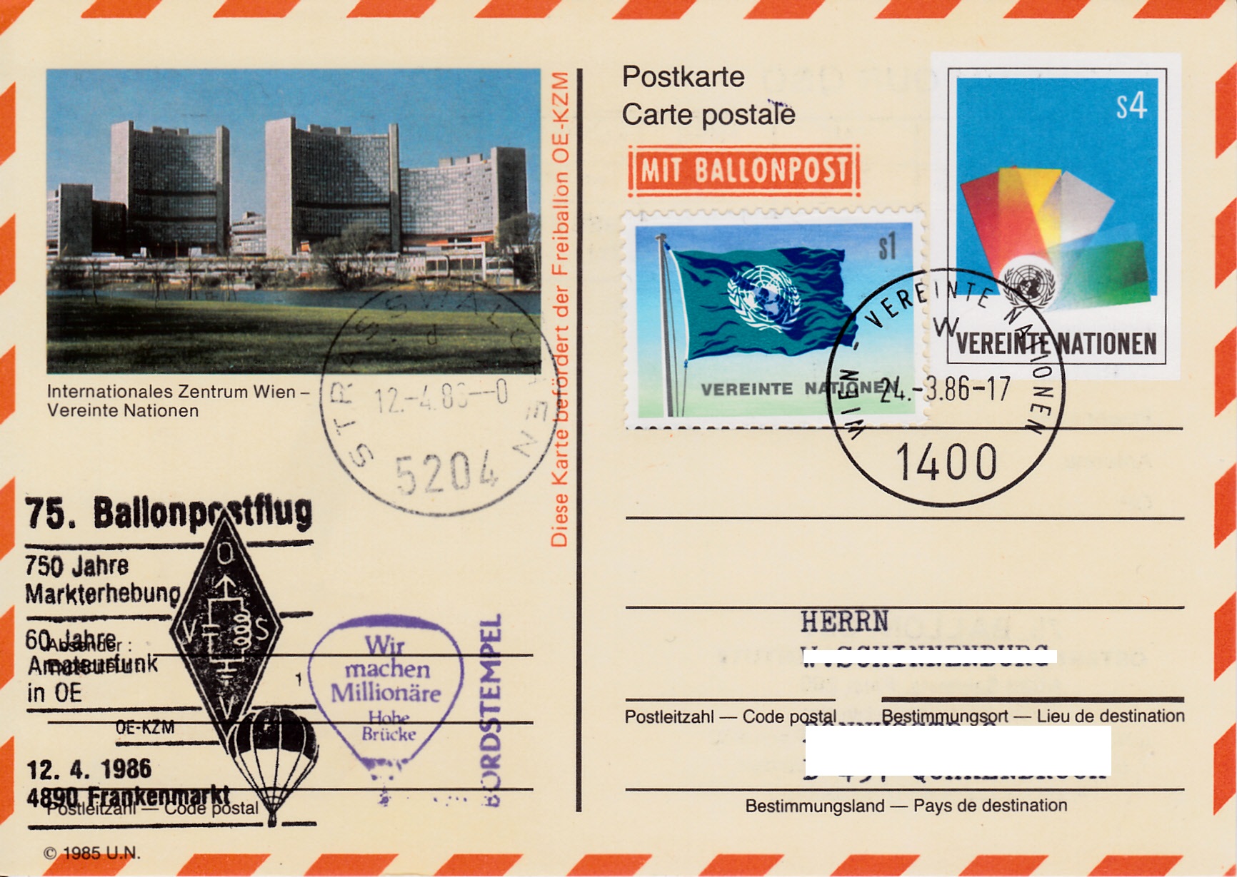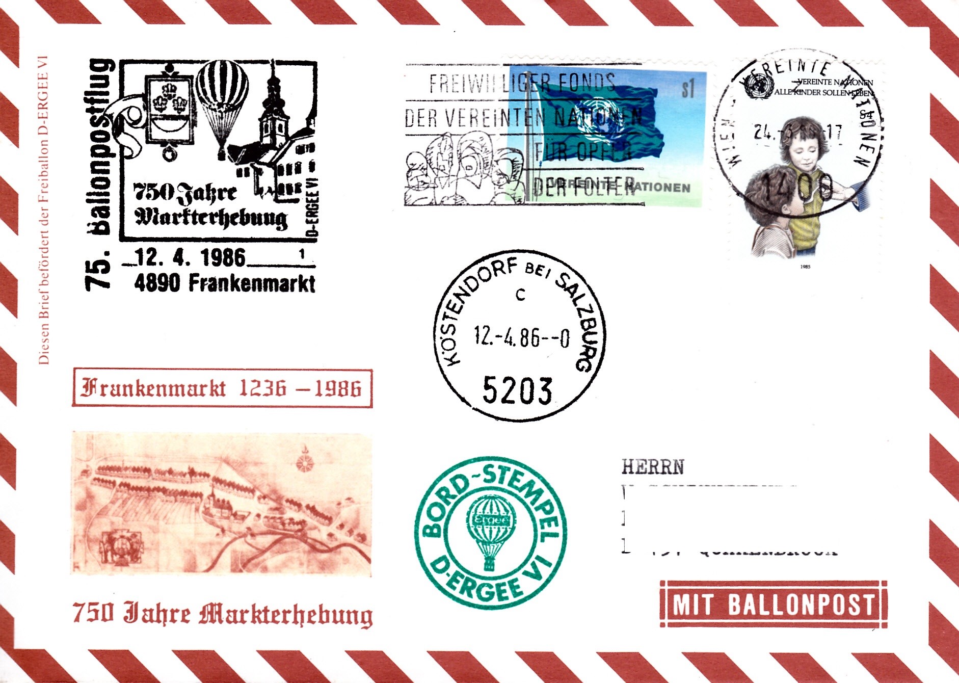 Dieser Brief wurde am 24.3.1986 für den 75. Ballonpostflug der Österreichischen Pro Juventute mit dem Freiballon D-ERGEE VI in Wien beim UNO-Postamt aufgegeben. Er erhielt einen Maschinenstempel Wien - Vereinte Nationen. Am 12.4.1986 wurde der Sonderstempel mit der Kennziffer "1" aus Frankenmarkt zu diesem Ballonflug auf dem Brief abgeschlagen. Er erhielt zusätzlich einen Tagesstempel Köstendorf bei Salzburg mit und einen Bordstempel.