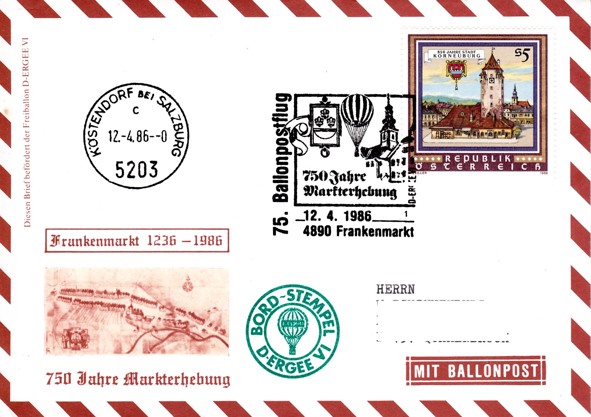 Dieser Brief wurde am 12.4.1986 in Frankenmarkt für den 75. Ballonpostflug der Österreichischen Pro Juventute mit dem Freiballon D-ERGEE VI aufgegeben. Er erhielt den Sonderstempel mit der Kennziffer "1" aus Frankenmarkt zu diesem Ballonflug und wurde am gleichen Tag mit dem Freiballon D-ERGEE VI befördert. Er erhielt zusätzlich einen Tagesstempel Köstendorf bei Salzburg und einen Bordstempel.