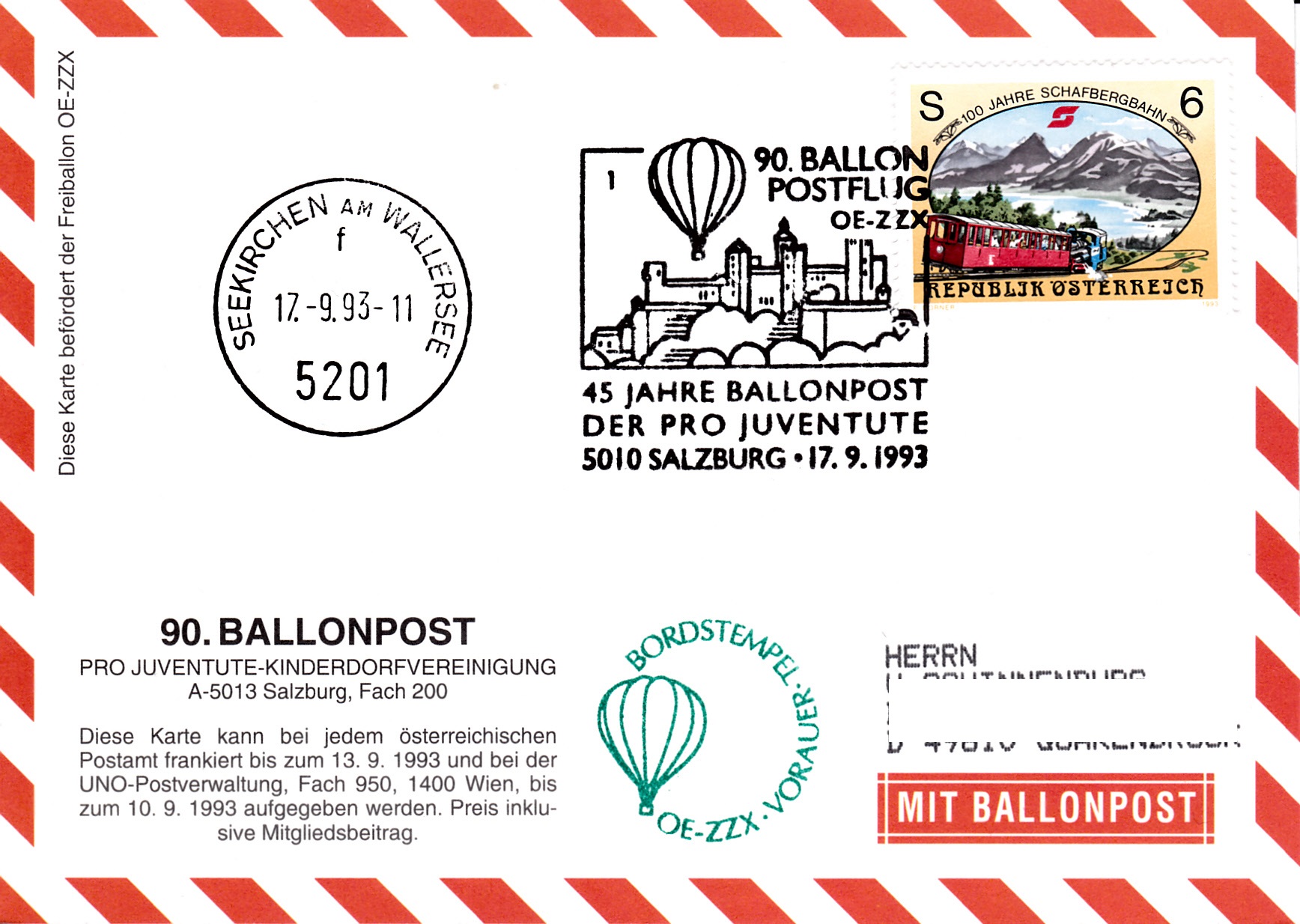 Diese Karte wurde am 17.9.1993 in Salzburg für den 90. Ballonpostflug der Österreichischen Pro Juventute mit dem Freiballon OE-ZZX aufgegeben. Sie erhielt den Sonderstempel mit der Kennziffer "1" aus Salzburg zu diesem Ballonflug und wurde am gleichen Tag mit dem Freiballon OE-ZZX befördert. Sie erhielt zusätzlich einen Tagesstempel Seekirchen am Wallersee und einen Bordstempel.