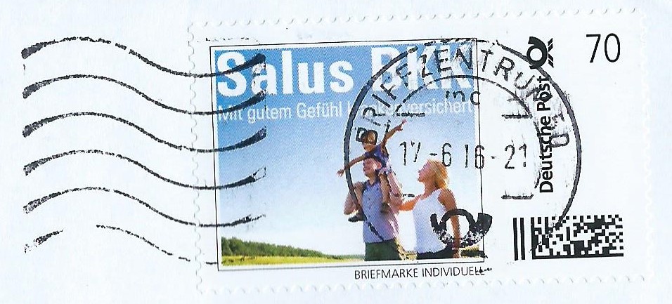 70 ct „mit gutem Gefühl krankenversichert“, mit einer kleinen Familie beim Ausflug im Grünen, Stempel Briefzentrum 50 vom 17.6.16