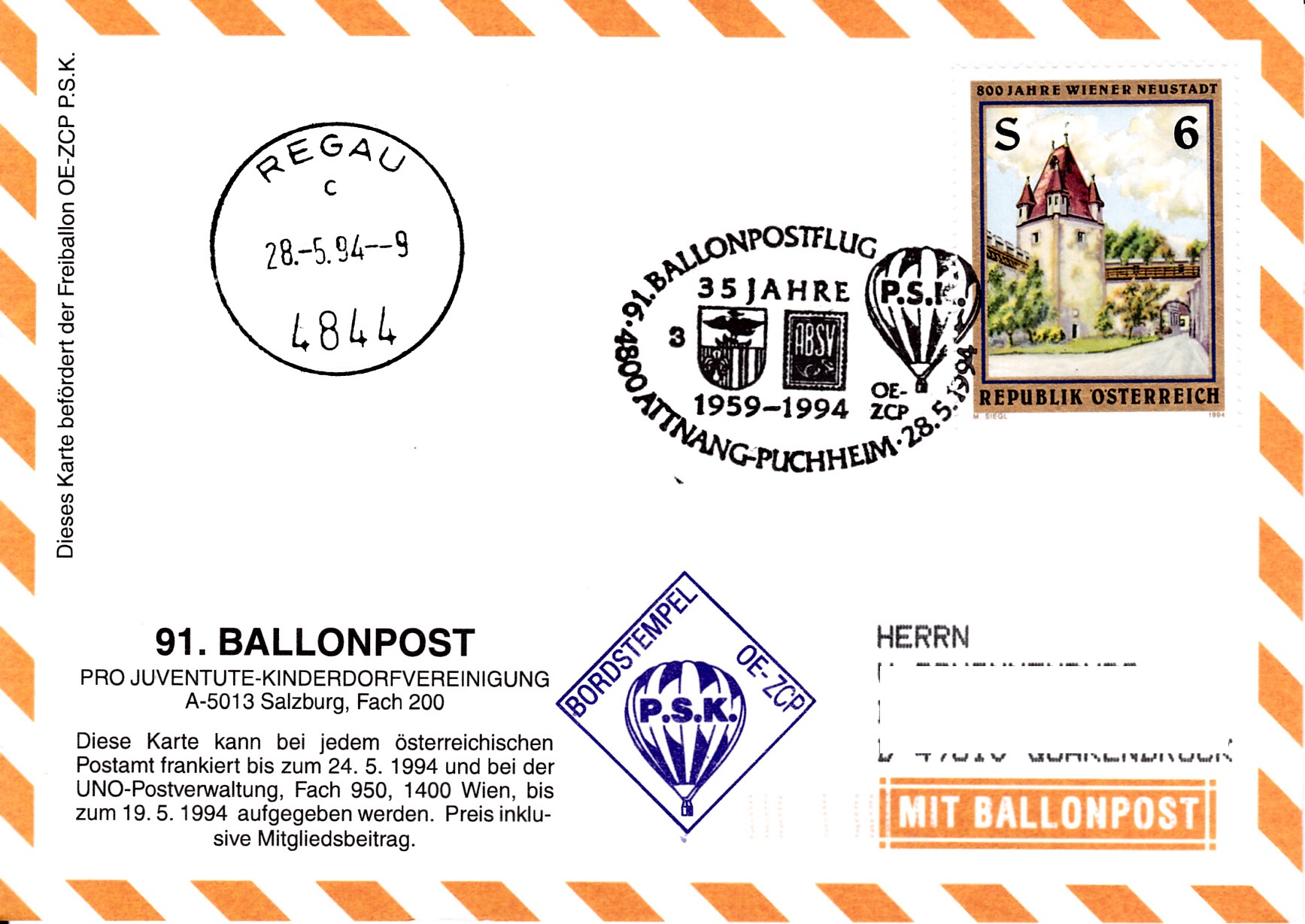 Diese Karte wurde am 28.5.1994 in Attnang-Puchheim für den 91. Ballonpostflug der Österreichischen Pro Juventute mit dem Freiballon OE-ZCP aufgegeben. Sie erhielt den Sonderstempel mit der Kennziffer "2" aus Attnang-Puchheim zu diesem Ballonflug und wurde am gleichen Tag mit dem Freiballon OE-ZCP befördert. Sie erhielt zusätzlich einen Tagesstempel Regau und einen Bordstempel.