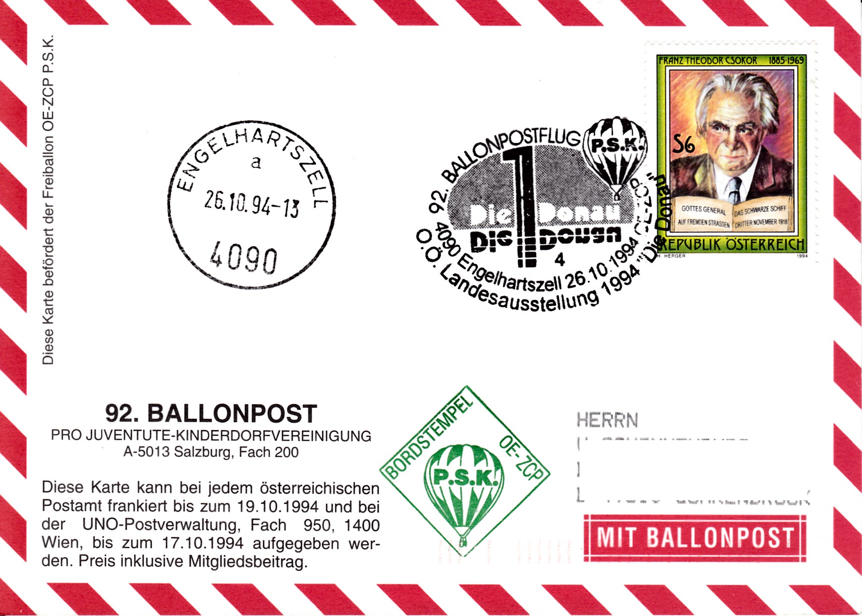 Diese Karte wurde am 13.10.1994 für den 92. Ballonpostflug der Österreichischen Pro Juventute mit dem Freiballon OE-ZCP in Wien beim UNO-Postamt aufgegeben. Die zur Frankatur verwendeten Marken der UNO-Postverwaltung Wien wurden mit einem Tagesstempel Wien - Vereinte Nationen gestempelt. Am 26.10.1994 erhielt die Karte den Sonderstempel aus Engelhartszell mit der Kennziffer "4" zu diesem 91. Ballonpostflug. Zusätzlich wurde ein Tagesstempel aus Engelhartszell und ein Bordstempel auf der Karte angebracht.