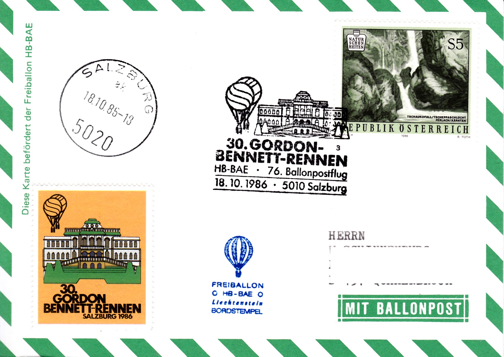 Diese Karte wurde am 18.10.1986 in Salzburg für den 76. Ballonpostflug der Österreichischen Pro Juventute mit dem Freiballon HB-BAE aufgegeben. Sie erhielt den Sonderstempel mit der Kennziffer "3" aus Salzburg zu diesem Ballonflug und wurde am gleichen Tag mit dem Freiballon HB-BAE befördert. Sie erhielt zusätzlich einen Tagesstempel Salzburg und einen Bordstempel.