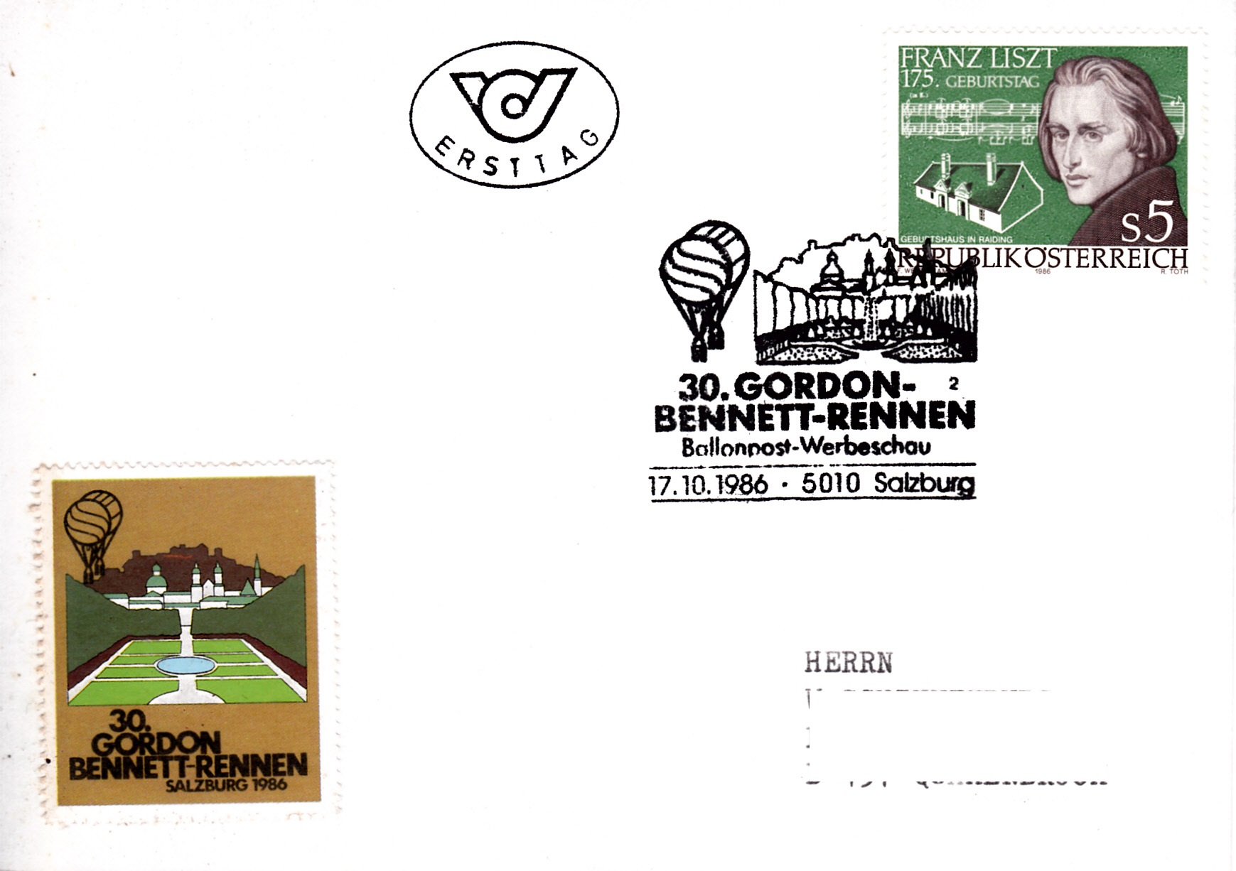 Der 76. Ballonpostflug wurde in Salzburg aus Anlass des 30. Gordon-Bennett-Cup (Ballonfahren), der ältesten jährlich stattfindenden internationalen Ballonsportveranstaltung für Gasballone. Der erste Wettbewerb wurde am 30. September 1906 in Paris ausgetragen. Unterbrechungen gab es von 1914 bis 1919 und von 1939 bis 1983. Obwohl diese Karte nicht mit einem Ballon befördert wurde, zeige ich sie in diesem Kapitel, da sie offensichtlich ebenfalls von der Österreichischen Pro Juventute produziert wurde. Die Karte wurde mit einem Sonderstempel zum 30. Gordon-Bennett-Cup vom 17.10.1986 mit der Kennziffer "2" gestempelt. Zusätzlich erhielt sie einen Stempel "Ersttag", da die zur Frankatur verwendete Marke an diesem Tag erschienen ist.