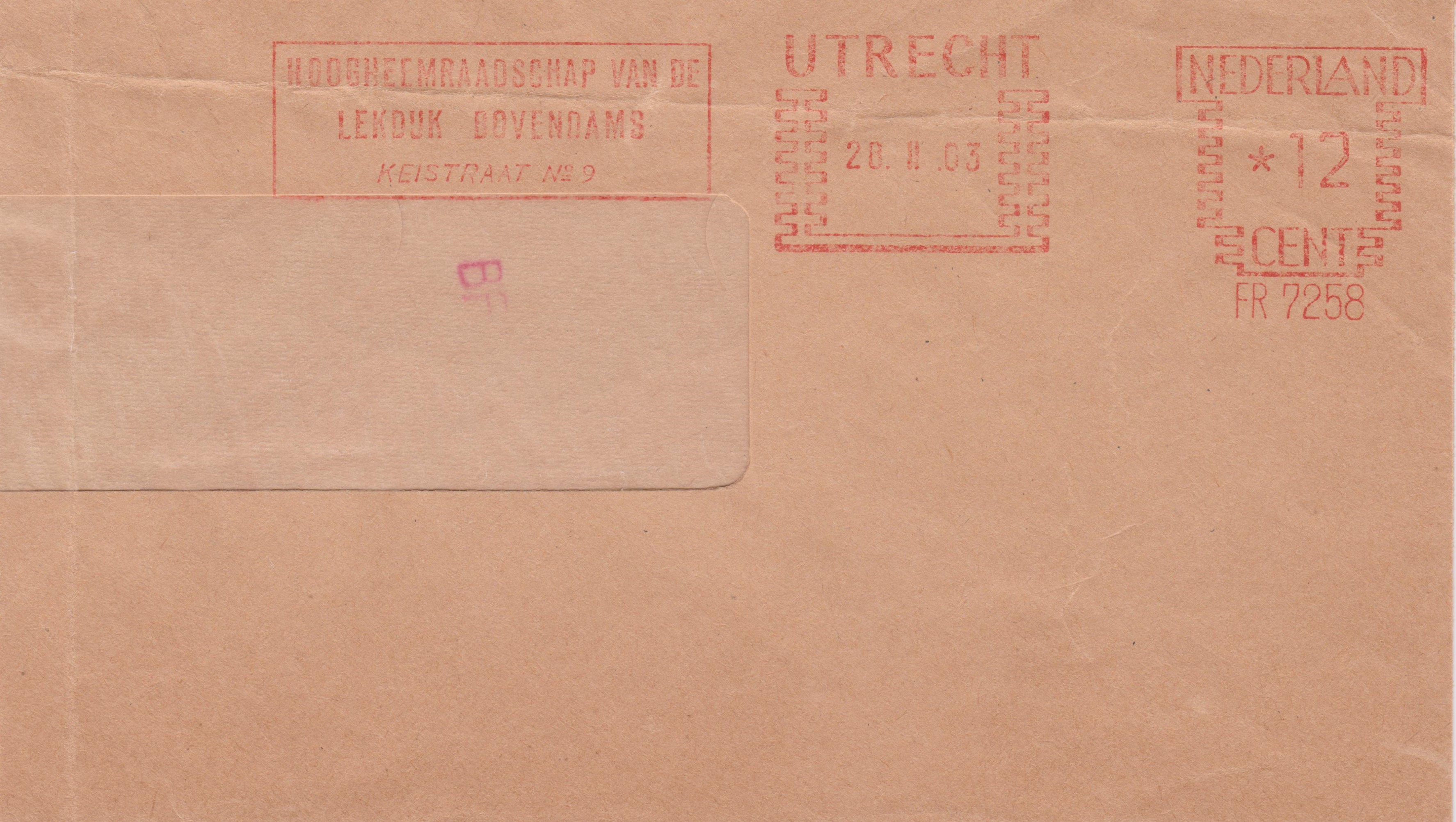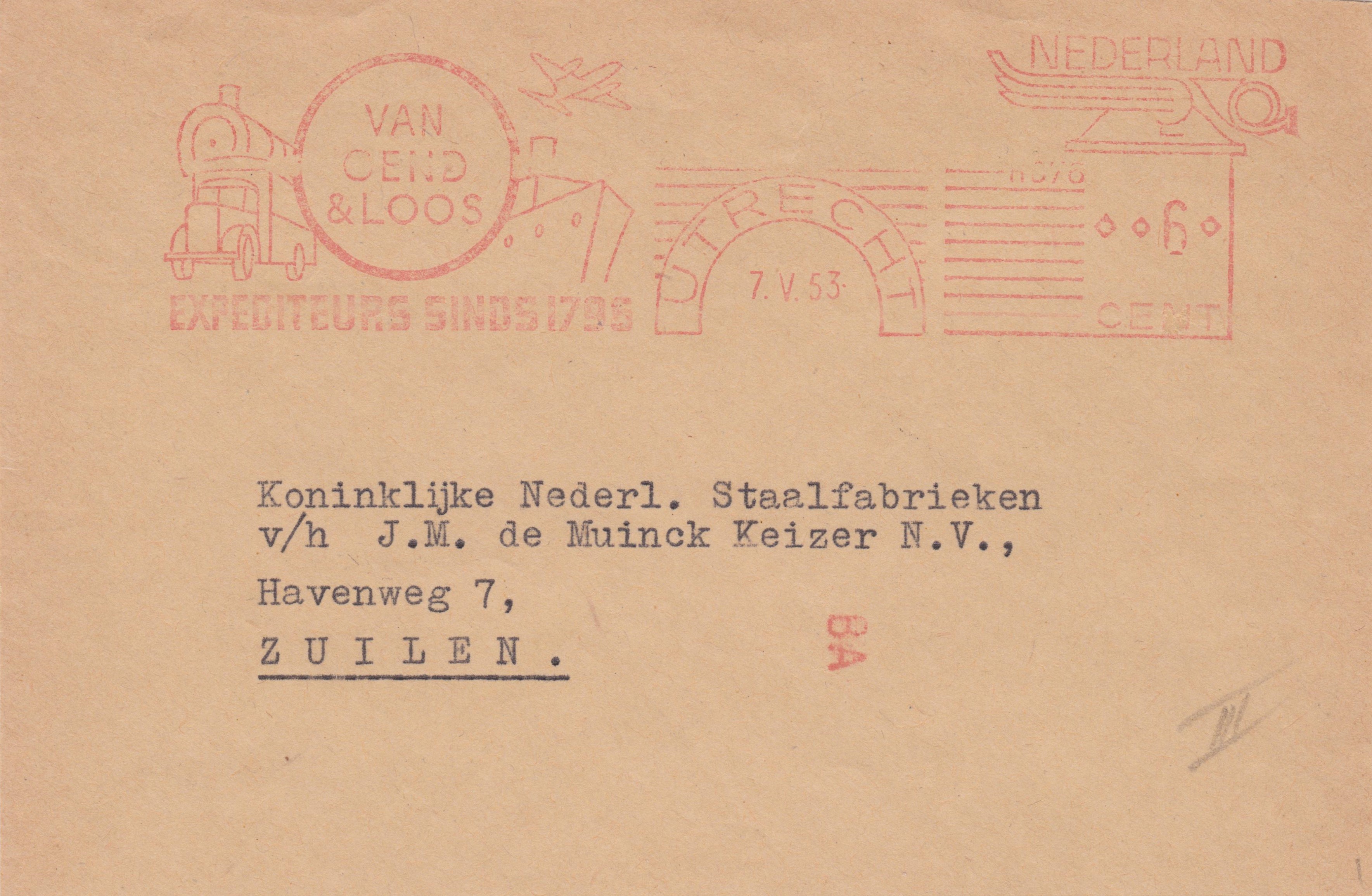Dieser am 07.05.1953 in UTRECHT aufgegebene Beleg nach ZUILEN erhielt in Utrecht eine Ausgangscodierung "BA" per Transorma: