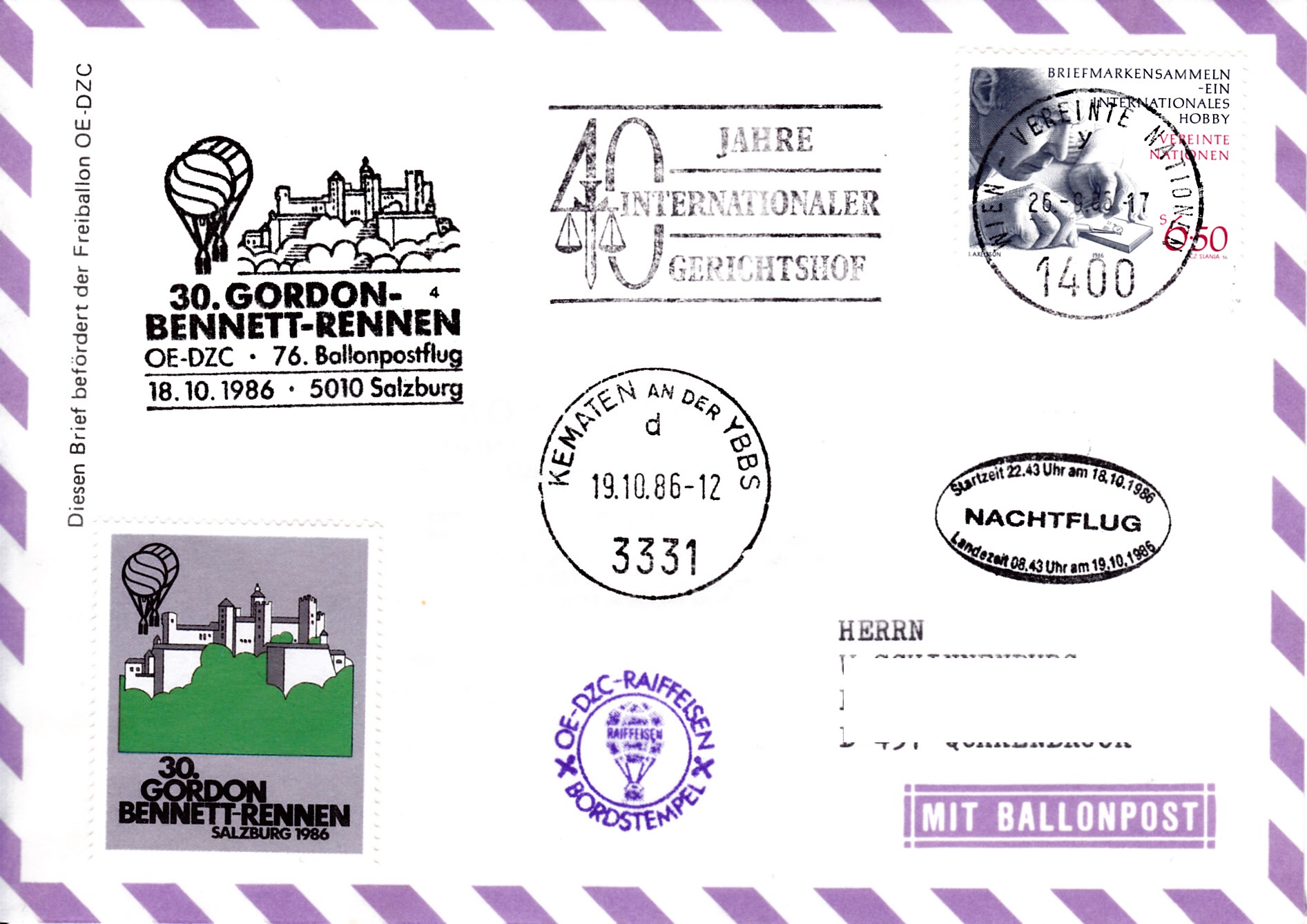 Dieser Brief wurde am 26.9.1986 für den 76. Ballonpostflug der Österreichischen Pro Juventute mit dem Freiballon OE-DZC in Wien beim UNO-Postamt aufgegeben. Die zur Frankatur verwendete Marke der UNO-Postverwaltung Wien wurde mit einem Maschinenstempel Wien - Vereinte Nationen gestempelt. Am 18.10.1986 erhielt der Brief den Sonderstempel aus Salzburg mit der Kennziffer "4" zu diesem 76. Ballonpostflug. Er erhielt zusätzlich einen Stempel "Nachtflug", einen Bordstempel und am 19.10.1986 einen Tagesstempel aus Kematen an der Ybbs.