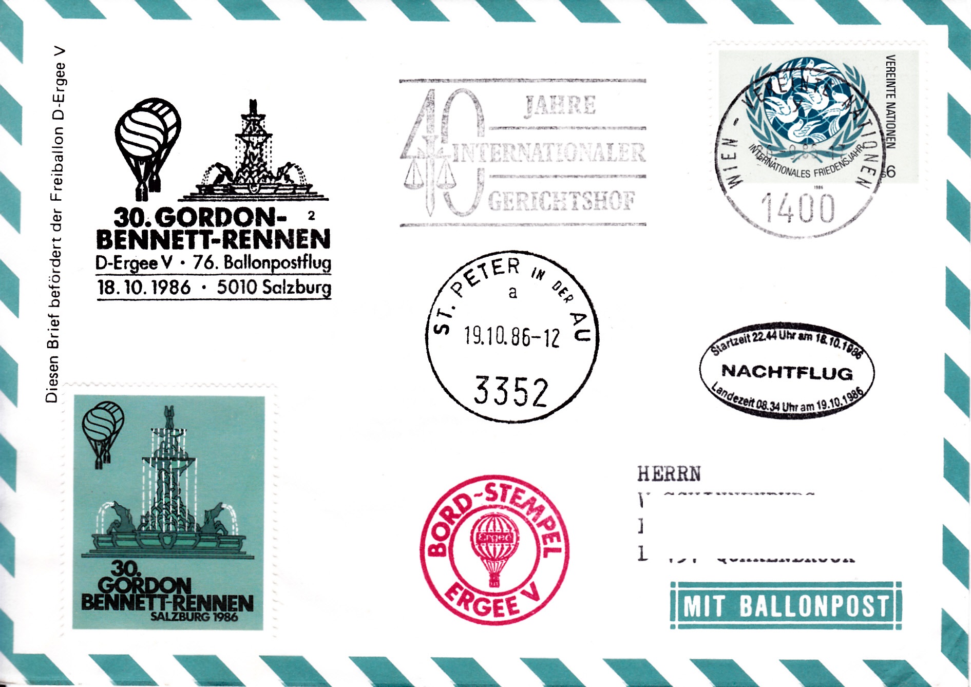 Dieser Brief wurde am 18.10.1986 in Salzburg für den 76. Ballonpostflug der Österreichischen Pro Juventute mit dem Freiballon D-Ergee V aufgegeben. Er erhielt den Sonderstempel mit der Kennziffer "2" aus Salzburg zu diesem Ballonflug und wurde am gleichen Tag mit dem Freiballon D-Ergee V befördert. Er erhielt zusätzlich einen Stempel "Nachtflug", einen Bordstempel und am 19.10.1986 einen Tagesstempel aus St. Peter in der Au.