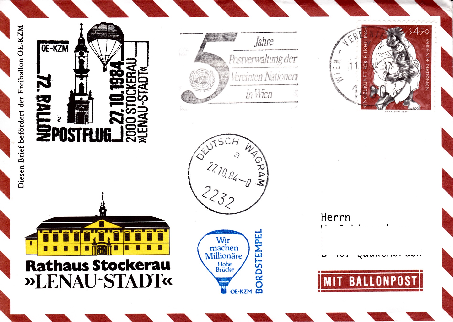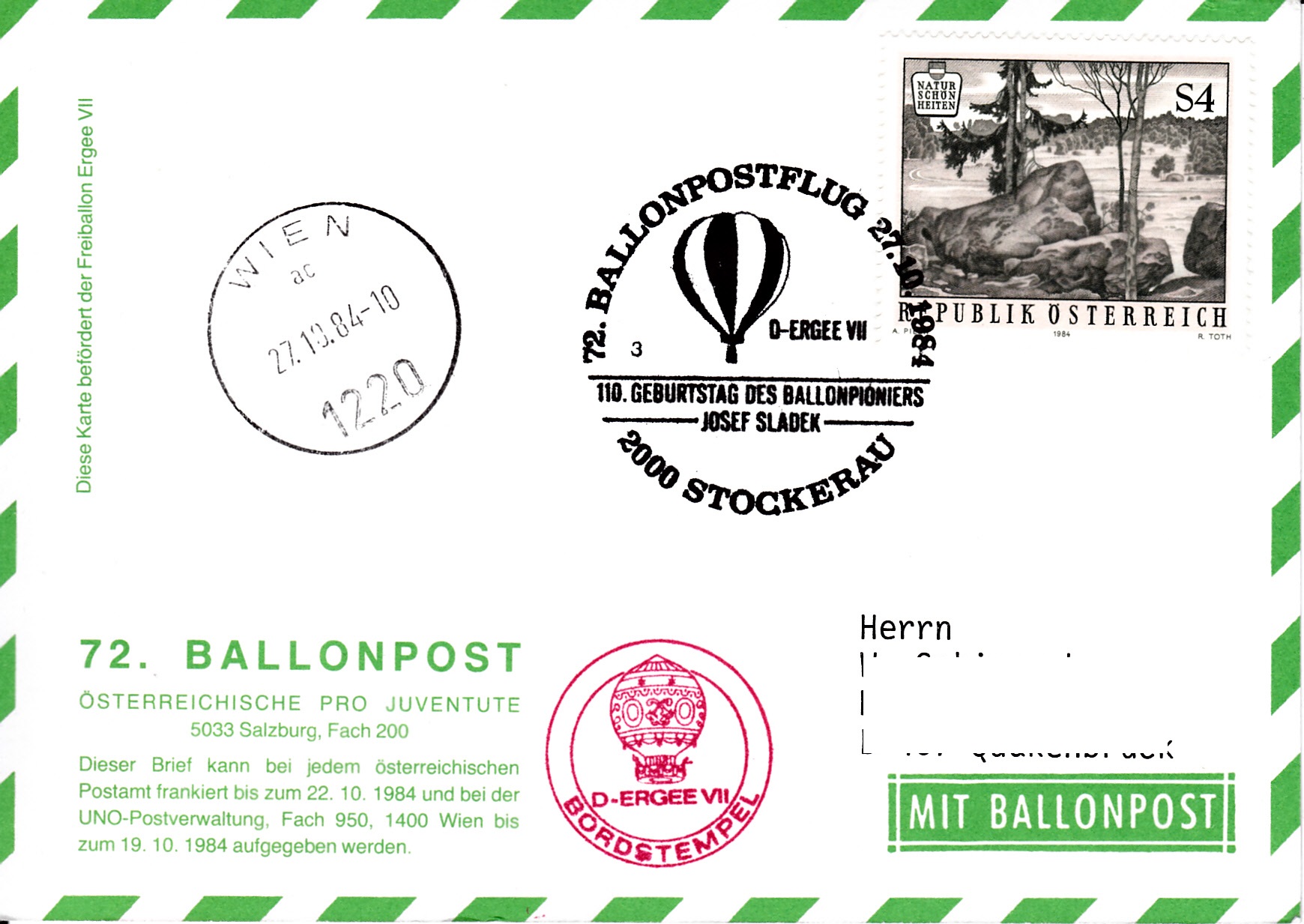 Dieser Brief wurde am 18.10.1986 in Salzburg für den 76. Ballonpostflug der Österreichischen Pro Juventute mit dem Freiballon OE-DZC aufgegeben. Er erhielt den Sonderstempel mit der Kennziffer "4" aus Salzburg zu diesem Ballonflug und wurde am gleichen Tag mit dem Freiballon OE-DZC befördert. Er erhielt zusätzlich einen Stempel "Nachtflug", einen Bordstempel und am 19.10.1986 einen Tagesstempel aus Kematen an der Ybbs.