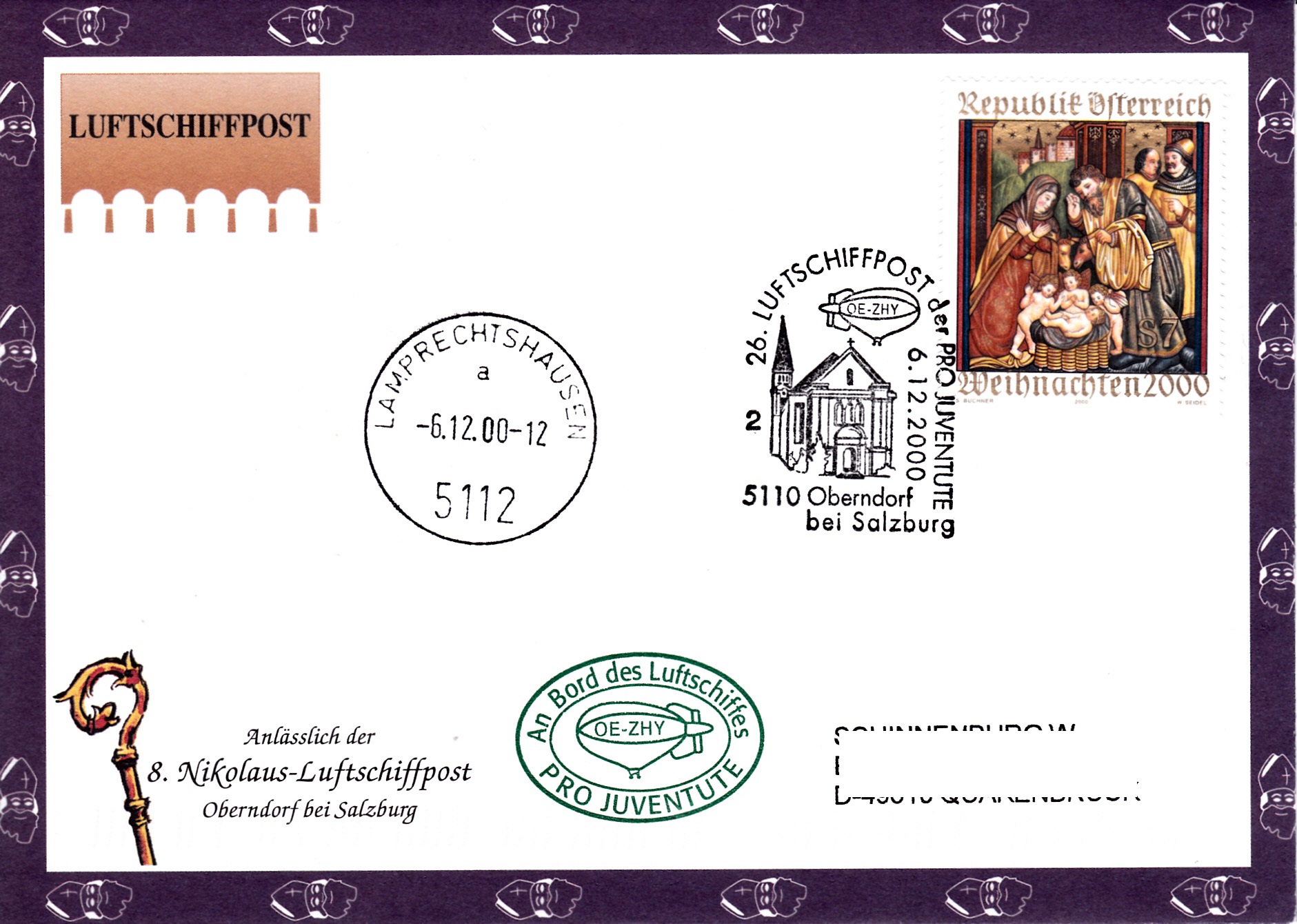 Dieser Brief wurde am 6.12.2000 bei einem Sonderpostamt in Oberndorf bei Salzburg für die 26. Luftschiffpost der Pro Juventute mit dem Luftschiff OE-ZHY aufgegeben. Die Marke wurde mit dem dazu passenden Sonderstempel gestempelt und am gleichen Tag mit dem Luftschiff OE-ZHY befördert. Der Brief erhielt noch einen Ortsstempel aus Lambrechtshausen mit dem Kennbuchstaben "a" und einen Bordstempel.