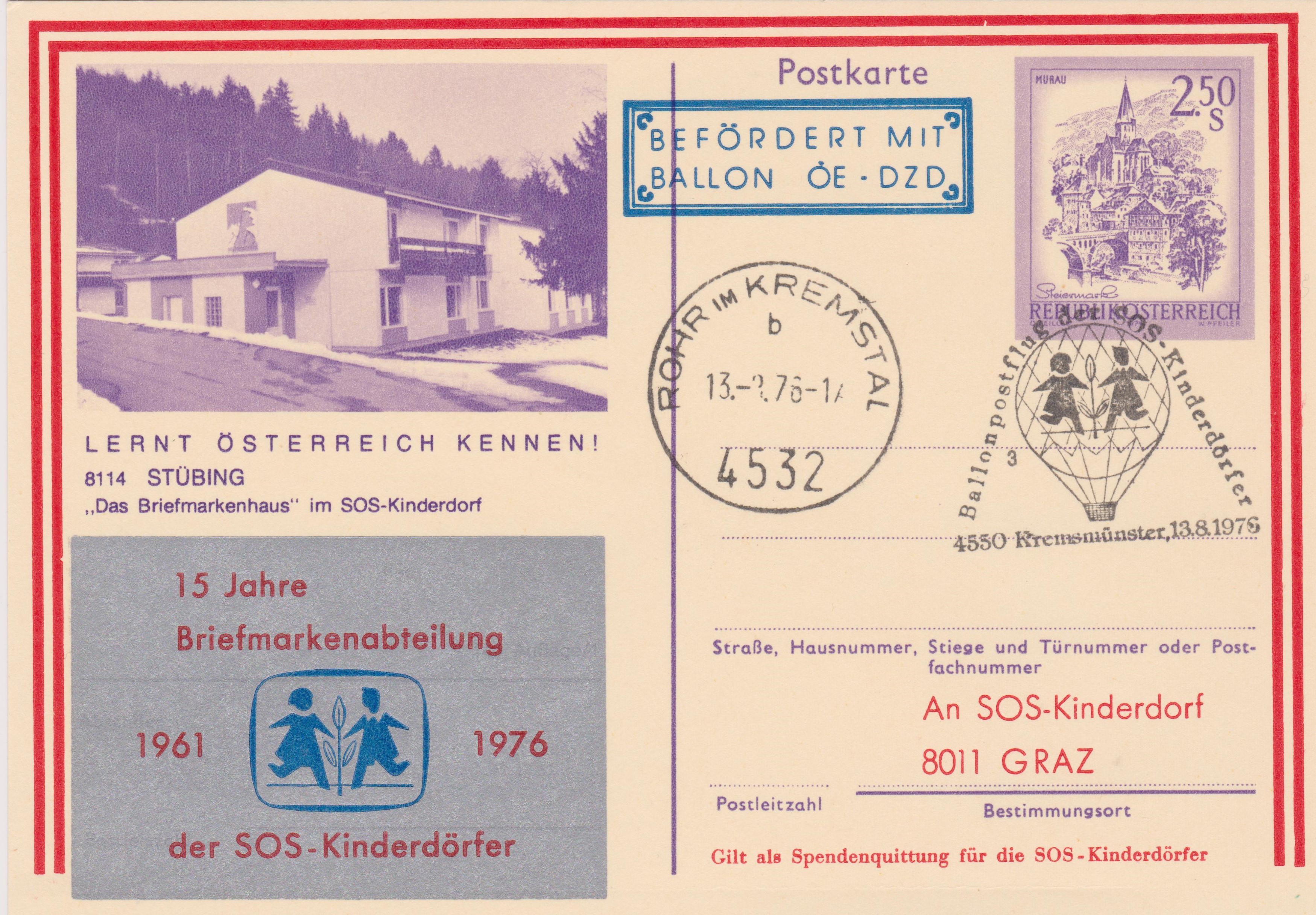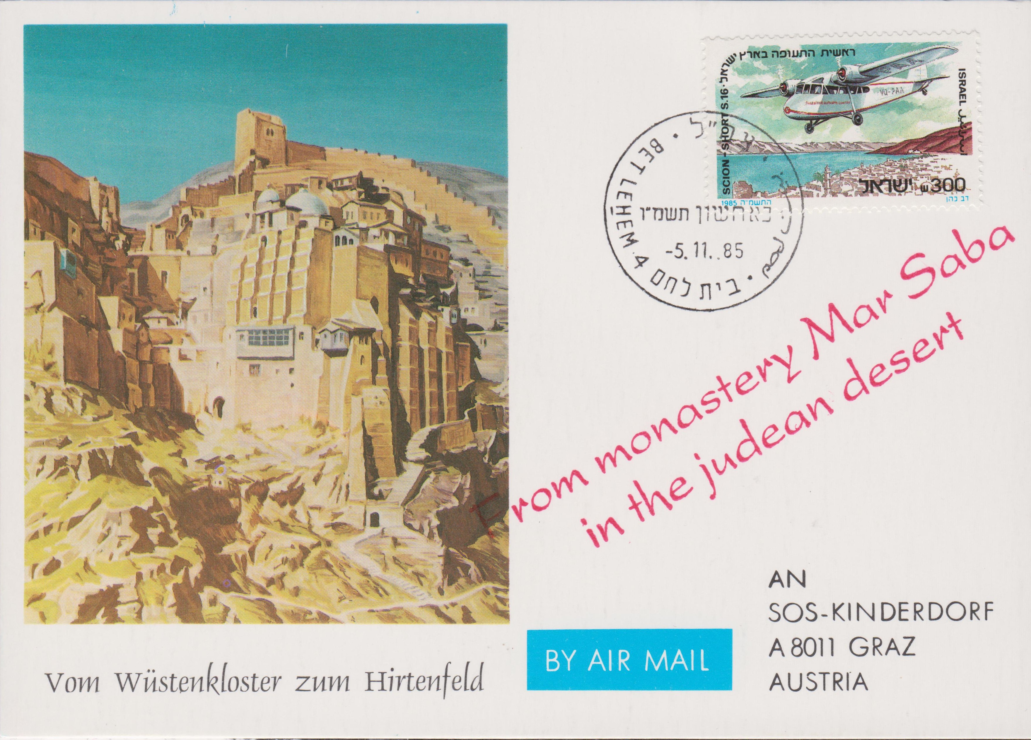 Diese Postkarte, adressiert an die Organisation SOS-KINDERDORF in Graz, wurde am 05.11.1985 in Bethlehem in Israel aufgegeben: