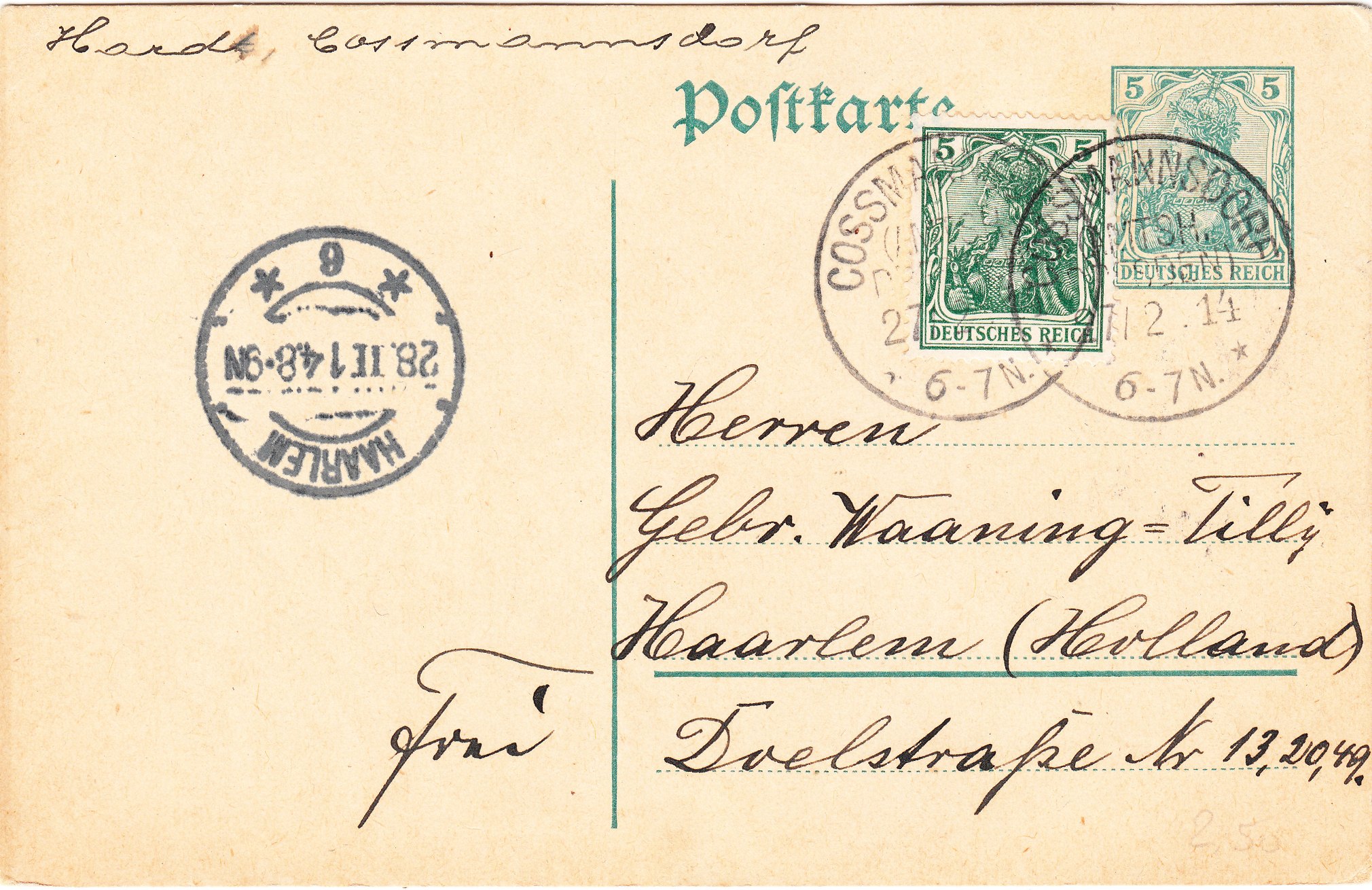 Sie deckte jedoch lediglich das Postkartenporto im Inland ab, Postkarten ins Ausland kosteten nicht 5 Pfennig, sondern 15 Pfennig Porto.