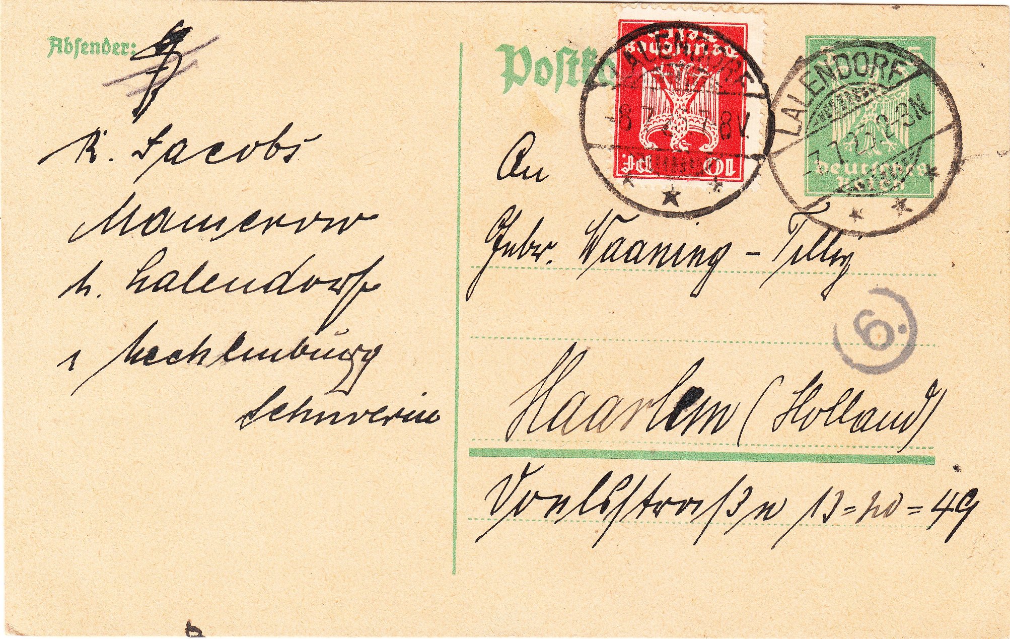 Dieser verklebte die für die Sendung ins Ausland notwendige Zusatzfrankatur von 10 Pfennig, die in LALENDORF dann am 08.07.1925 per Tagesstempel entwertet wurde.