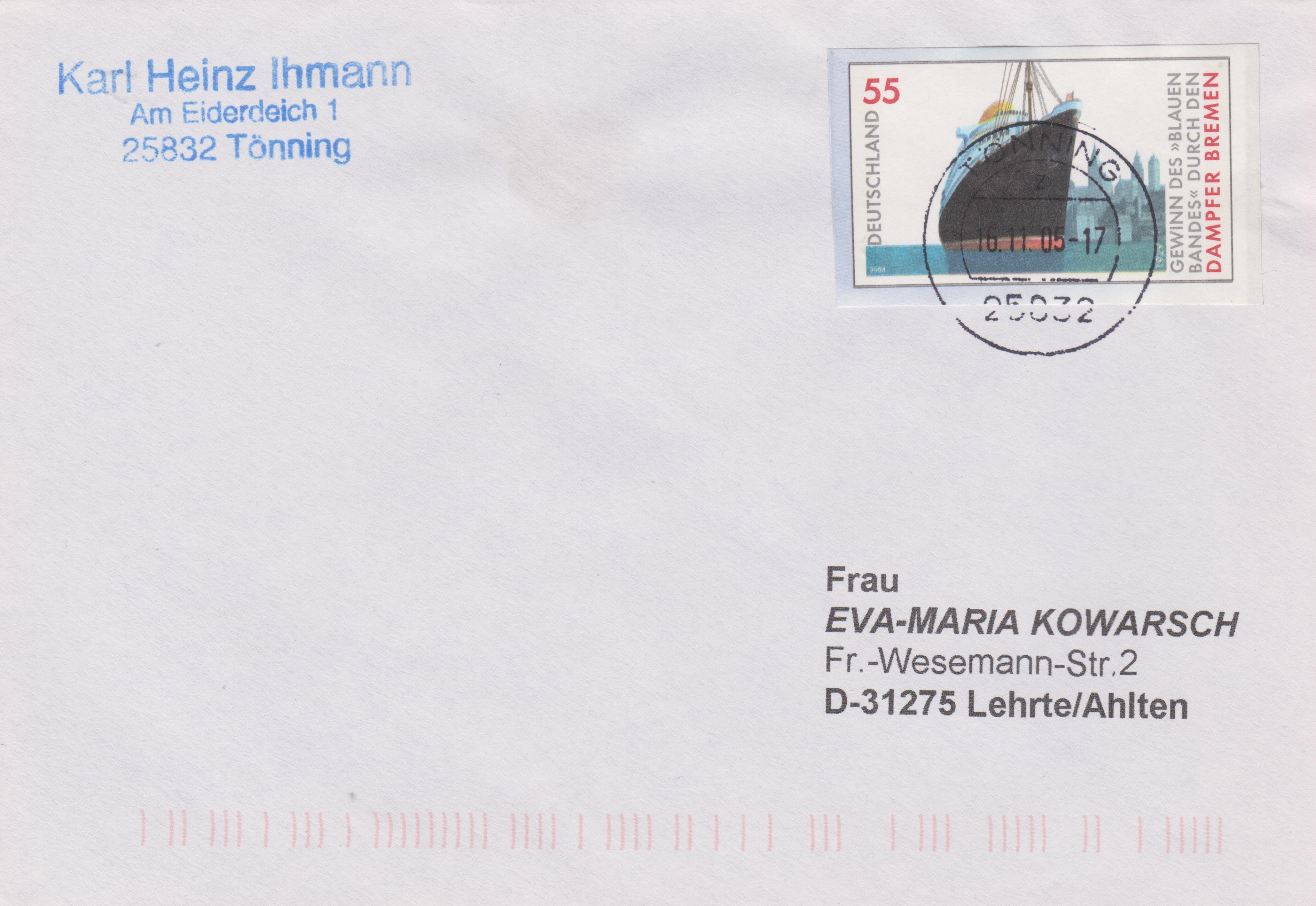 Inlandsbrief, Portostufe 55 Cents, frankiert mit einem Ausschnitt der MiNr. 2412 aus einer Ganzsache USo 88, adressiert nach "31275 Lehrte", aufgegeben am 16.11.2005 "25832 TÖNNING":