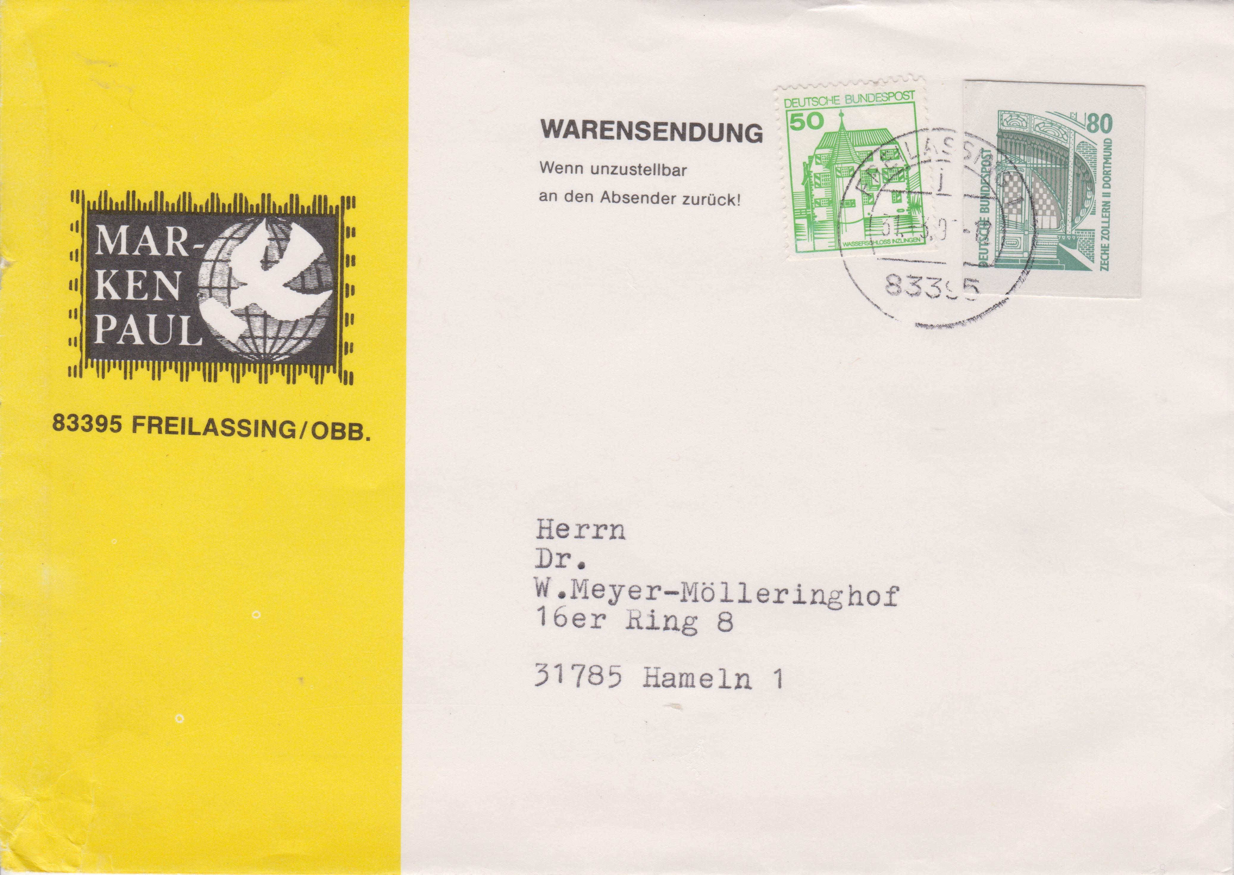 Warensendung von 21 bis 50 g, am 31.03.1997 in 83395 FREILASSING portorichtig freigemacht mit 130 Pf in Form einer Mischfrankatur unter Verwendung eines GAA der Werststufe 80 Pf der Dauerserie SWK: