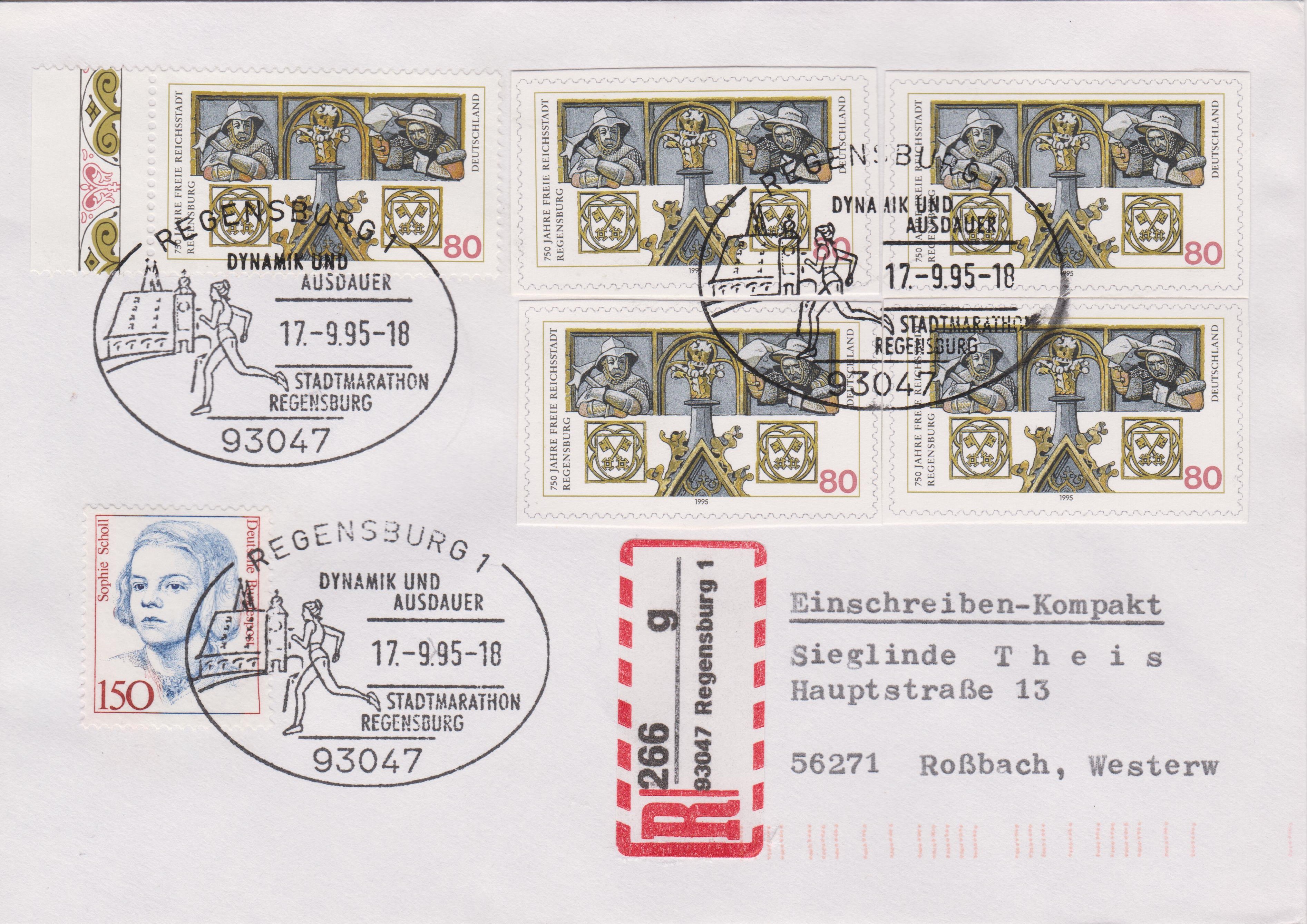 Vier GAA "750 Jahre Freie Reichsstadt Regensburg" aus der Sonderpostkarte PSo 37 als Mischfrankatur mit einer MiNr. 1786 sowie 150 Pf der Dauerserie Frauen am 17.09.1995 auf "Einschreiben-Kompakt" von 93047 Regensburg 1 nach 56271 Roßbach, Westerwald , echt gelaufen mit Codierung: