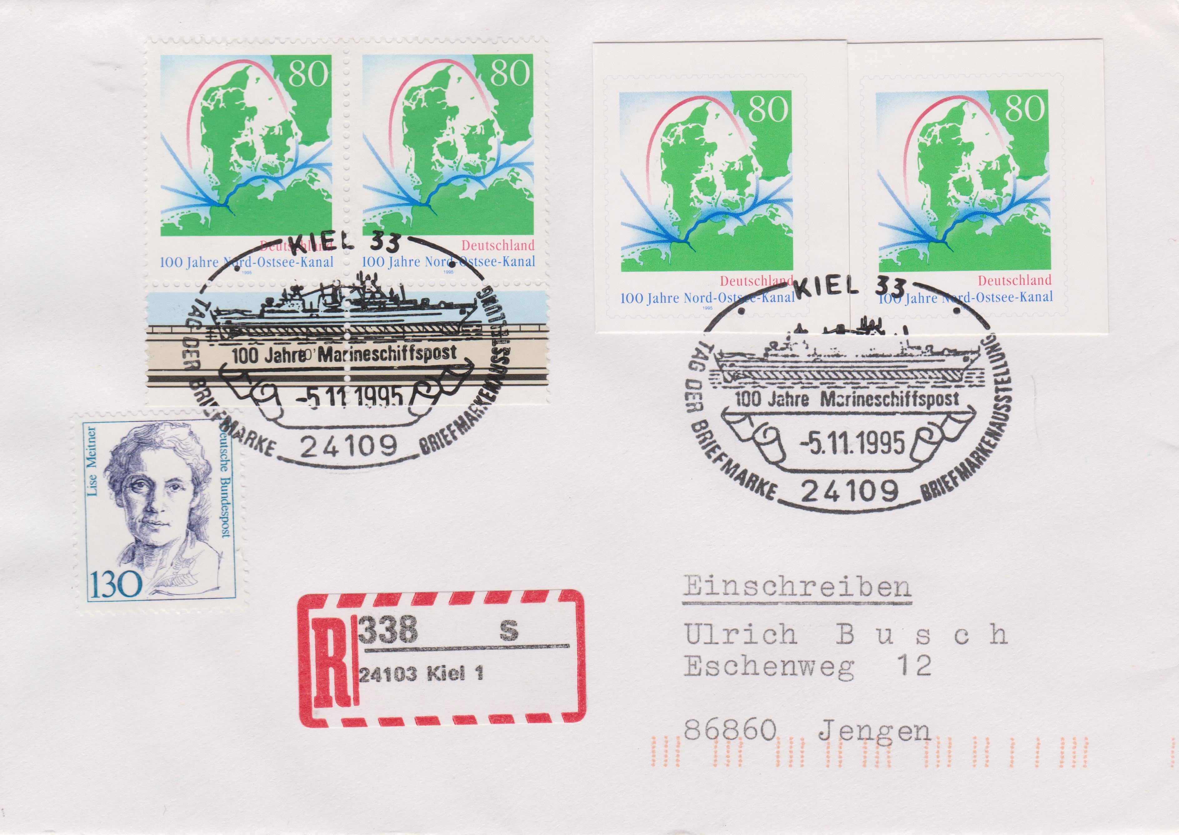 Zwei GAA "100 Jahre Nord-Ostsee-Kanal" aus der Sonderpostkarte PSo 38 als Mischfrankatur mit einem Paar der bildgleichen MiNr. 1802 vom unteren Bogenrand sowie 130 Pf der Dauerserie Frauen am 05.11.1995 auf Einschreiben von 24103 Kiel nach 86860 Jengen, echt gelaufen mit Codierung: