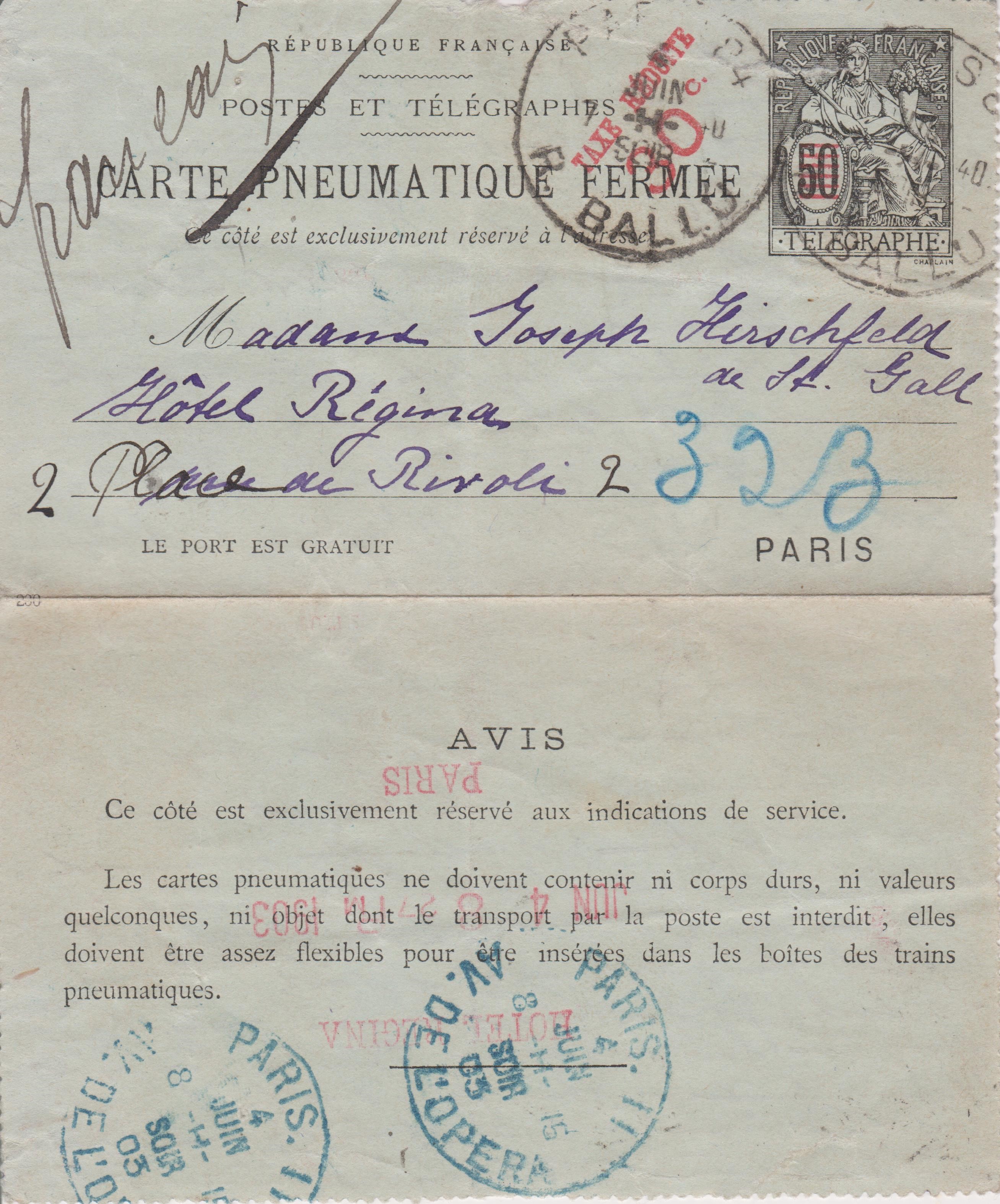 Diese Sendung wurde adressiert an das "Hotel Regina", wo als Zimmernummer des Empfängers handschriftlich in Blau "323" eingetragen wurde!