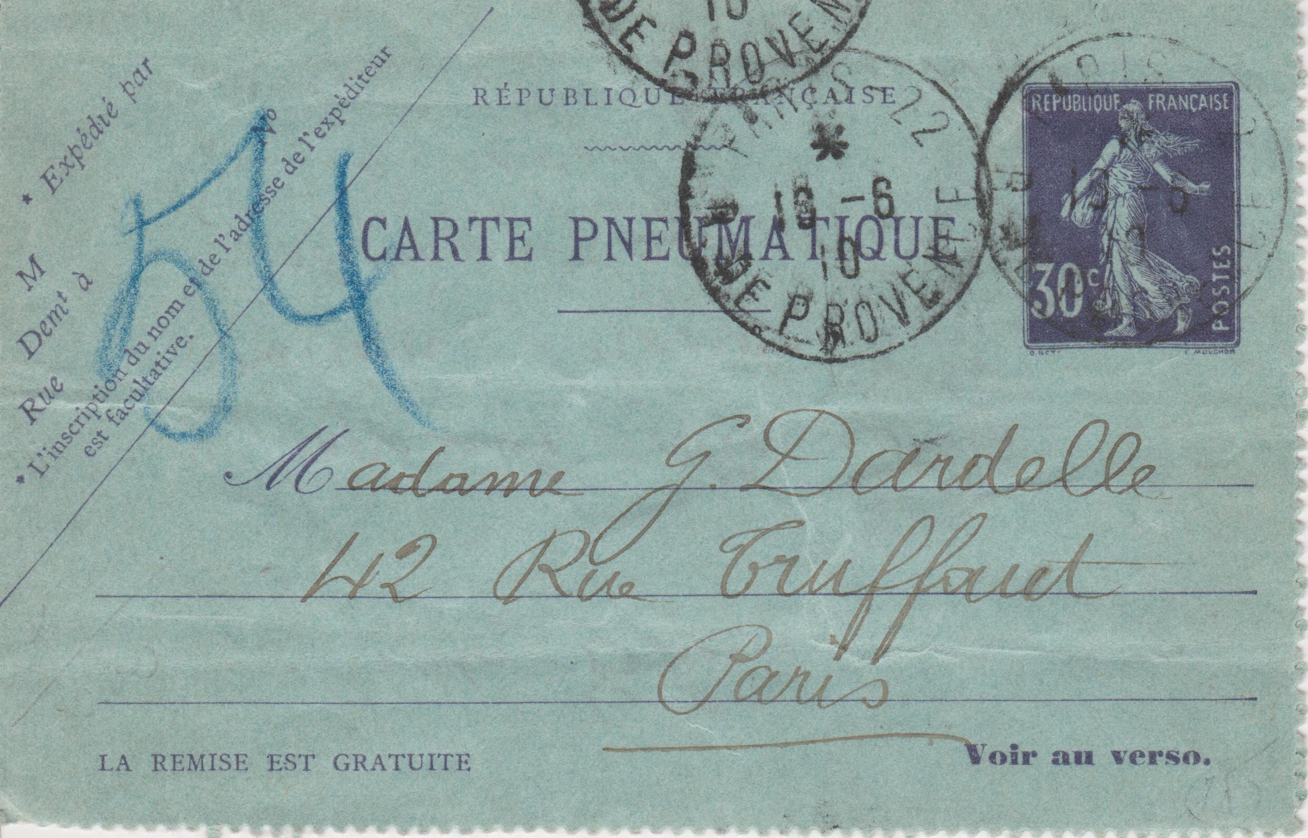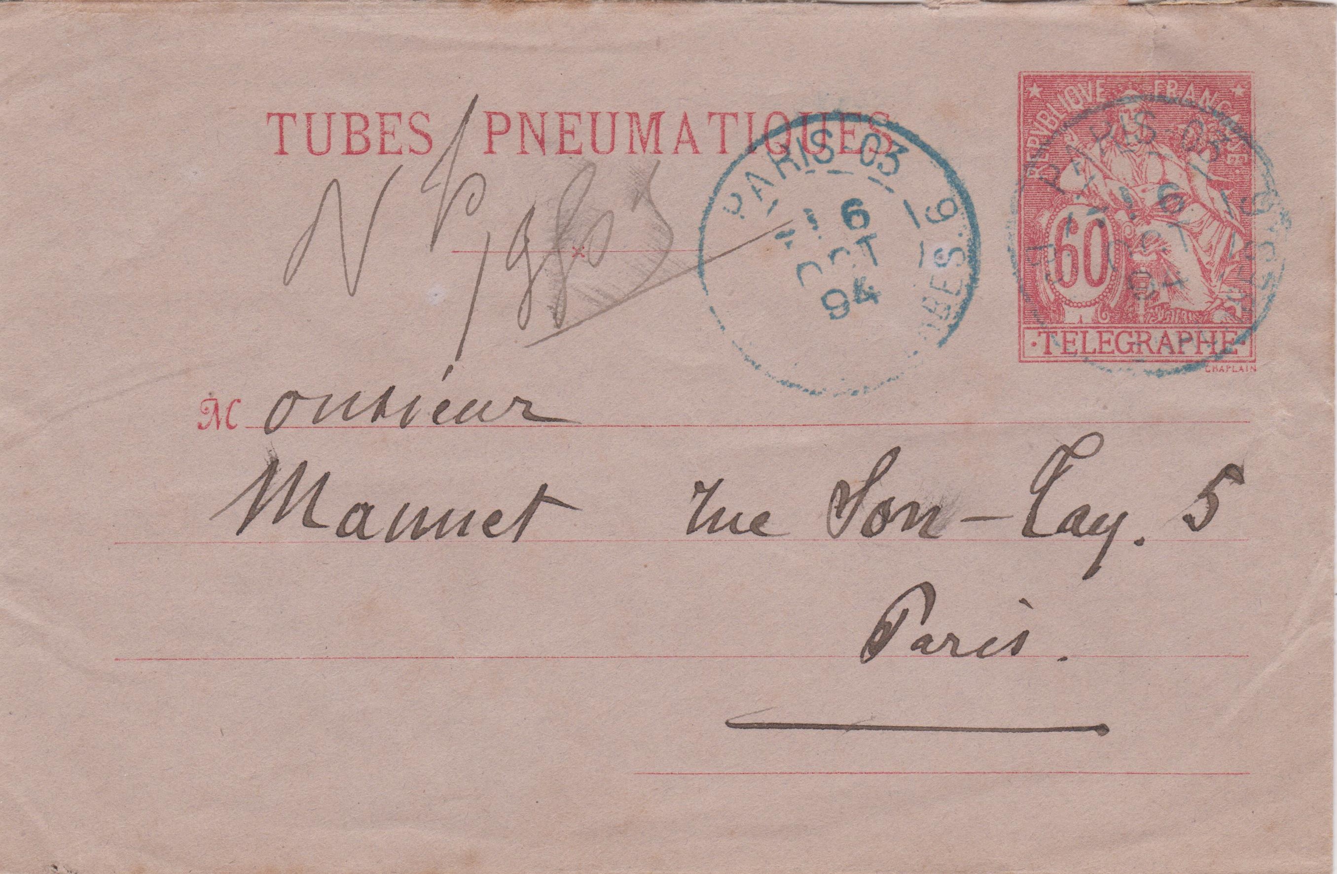 Rohrpost-Kartenbrief "CARTE PNEUMATIQUE FERMEE" mit Aufdruck der neuen Wertstufe "30" statt 50 Centimes: