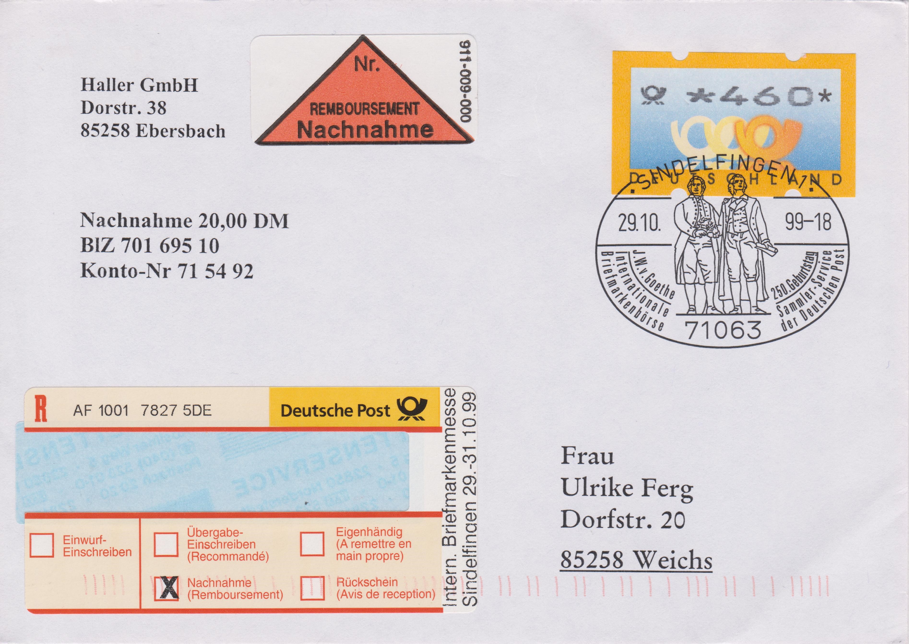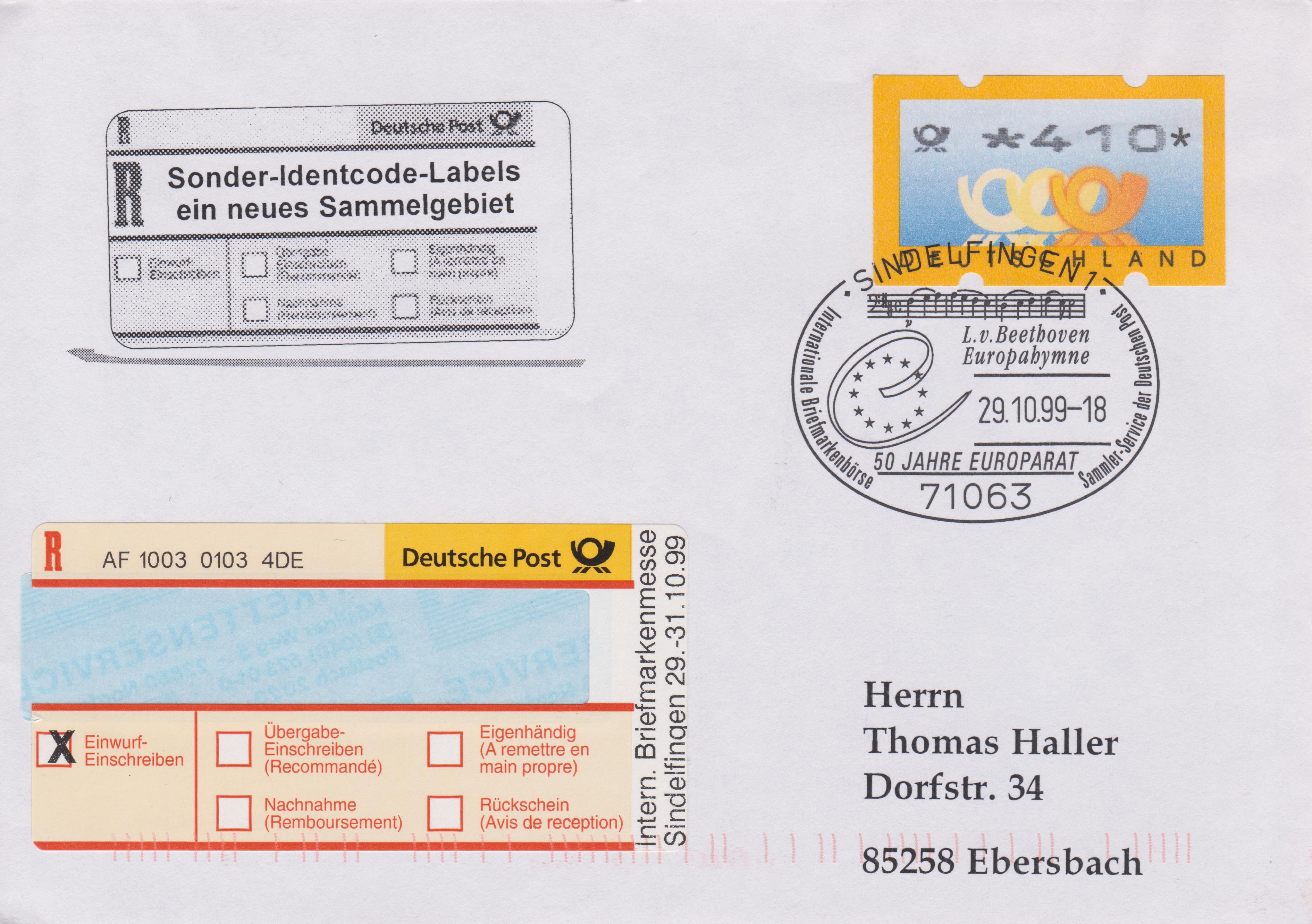 Einlieferungsbeleg vom 29.10.1999 zu einem Einschreiben mit Sonder-Identcode-Label "Intern. Briefmarkenmesse Sindelfingen 29.-31.10.99", X-So-16-NN:
