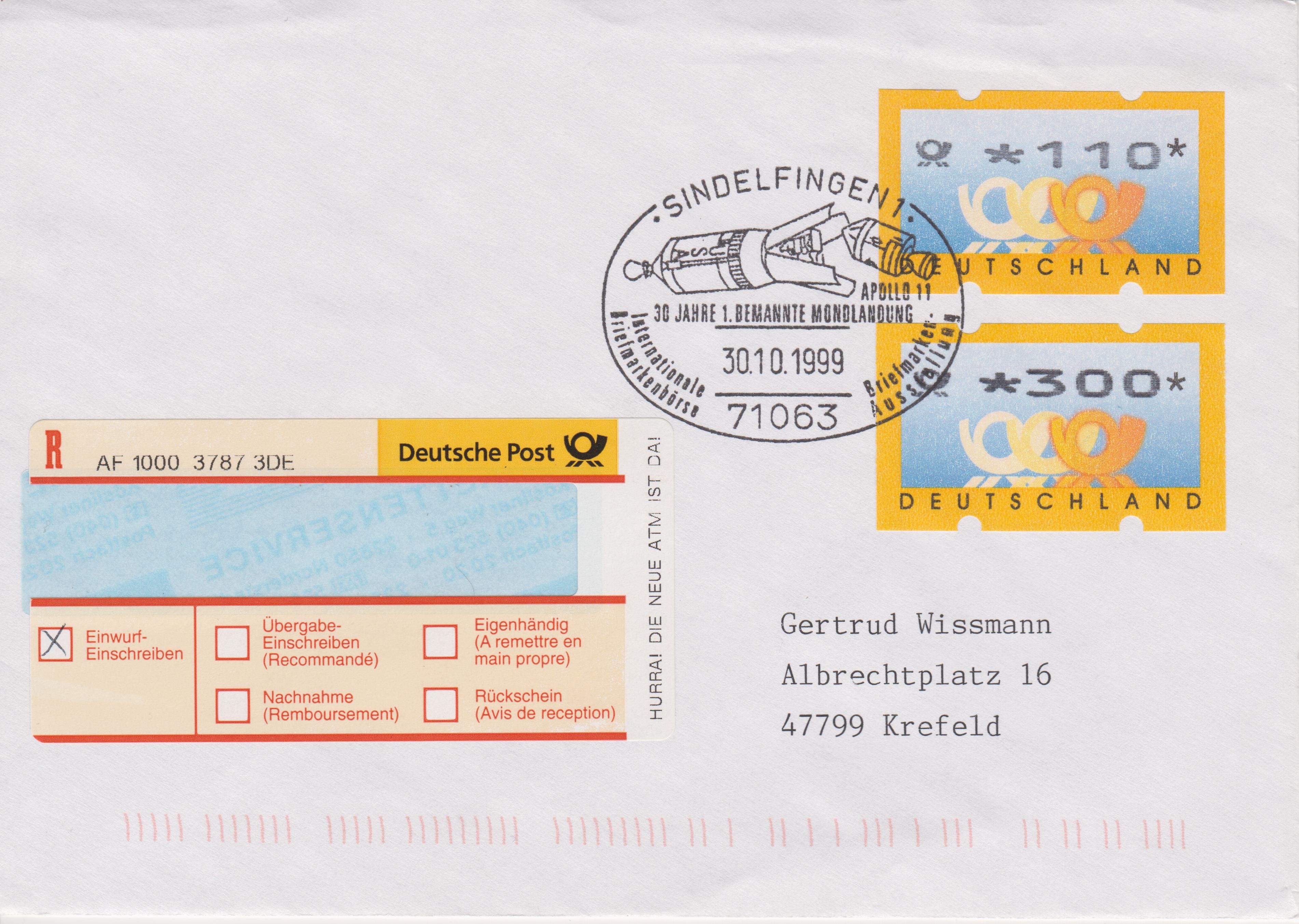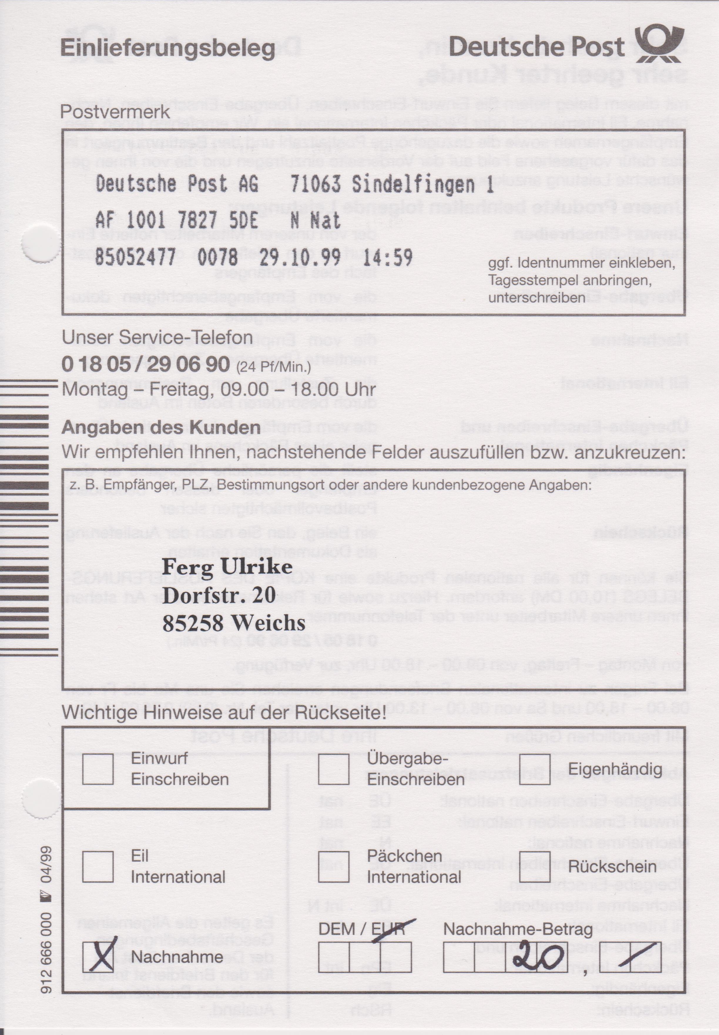 Einlieferungsbeleg vom 30.10.1999 zu einem Einschreiben mit Sonder-Identcode-Label "HURRA! DIE NEUE ATM IST DA!", X-So-3-EE: