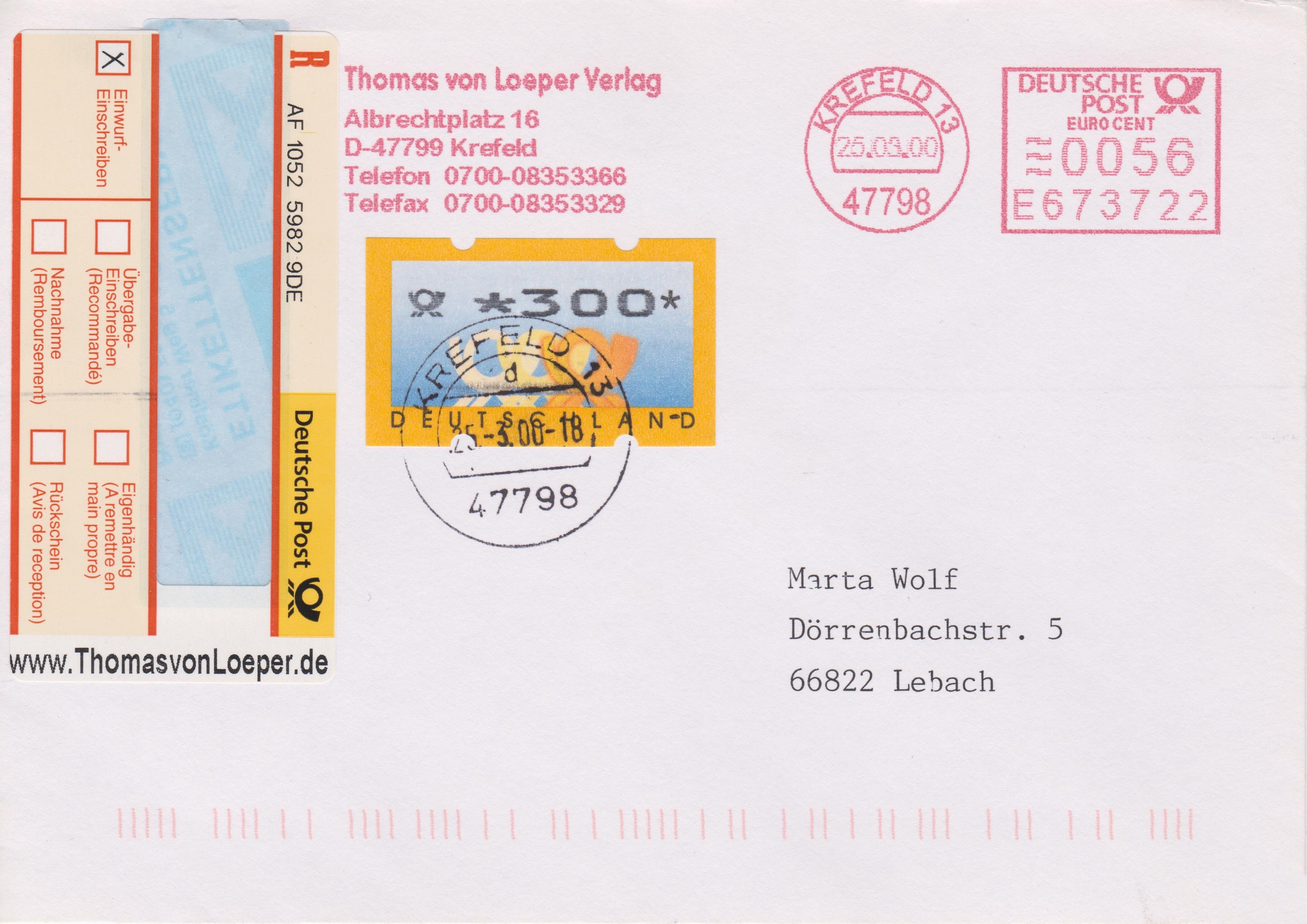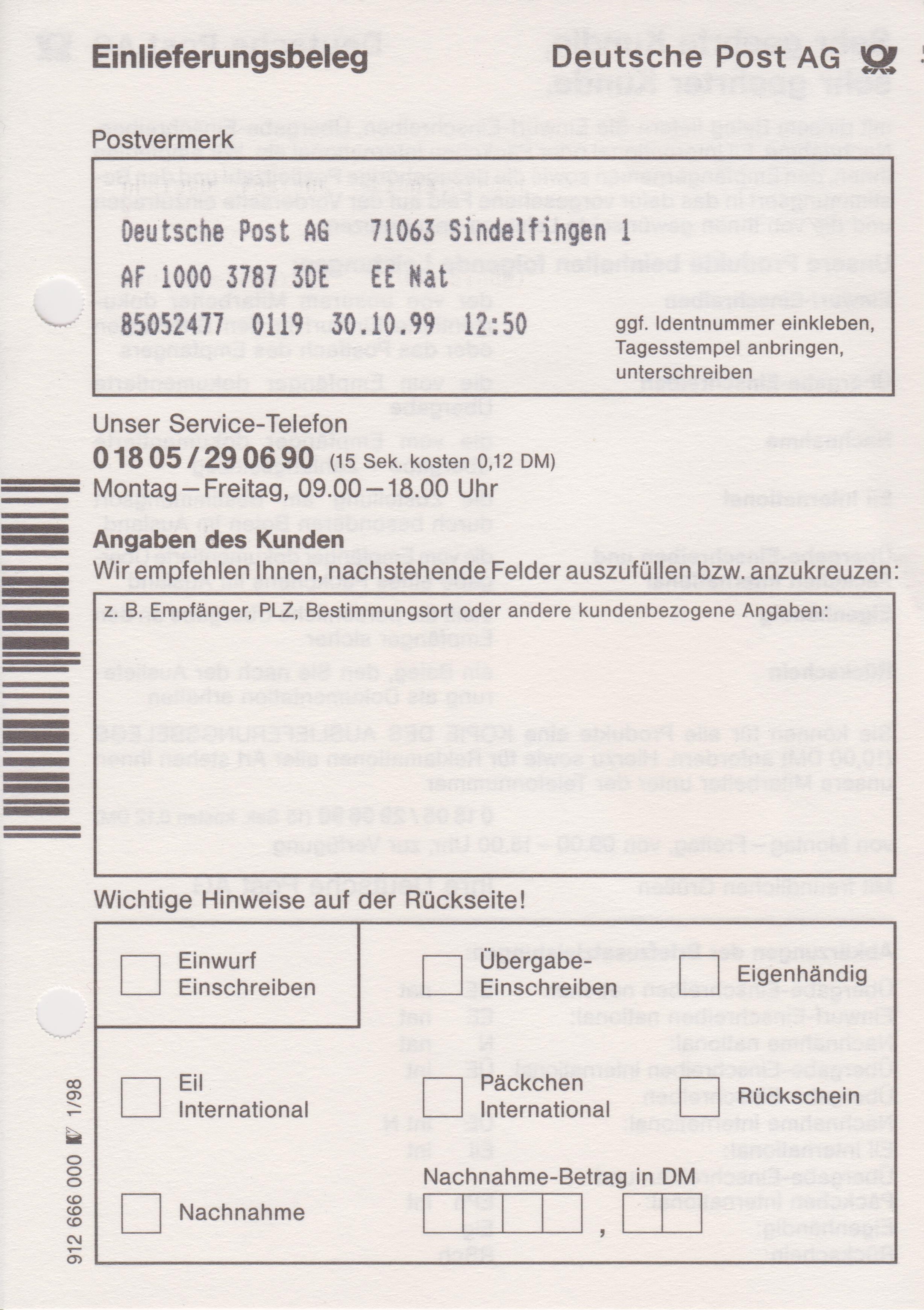 Einlieferungsbeleg vom 25.03.2000 zu einem Einwurf-Einschreiben mit Sonder-Identcode-Label "www.ThomasvonLoeper.de", X-So-77: