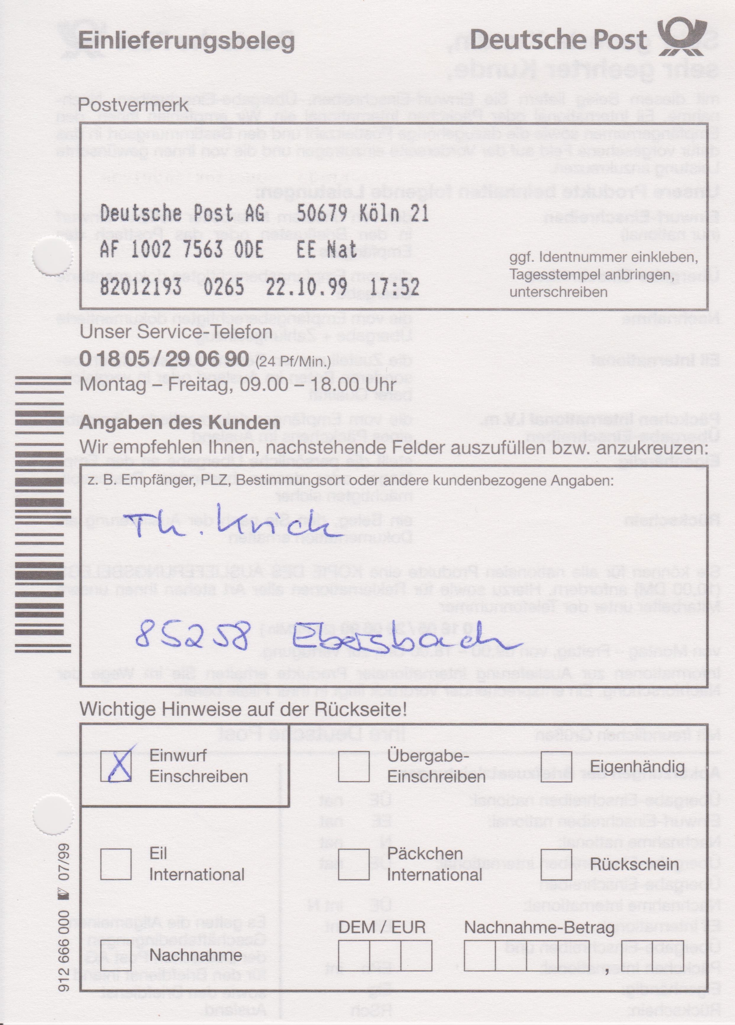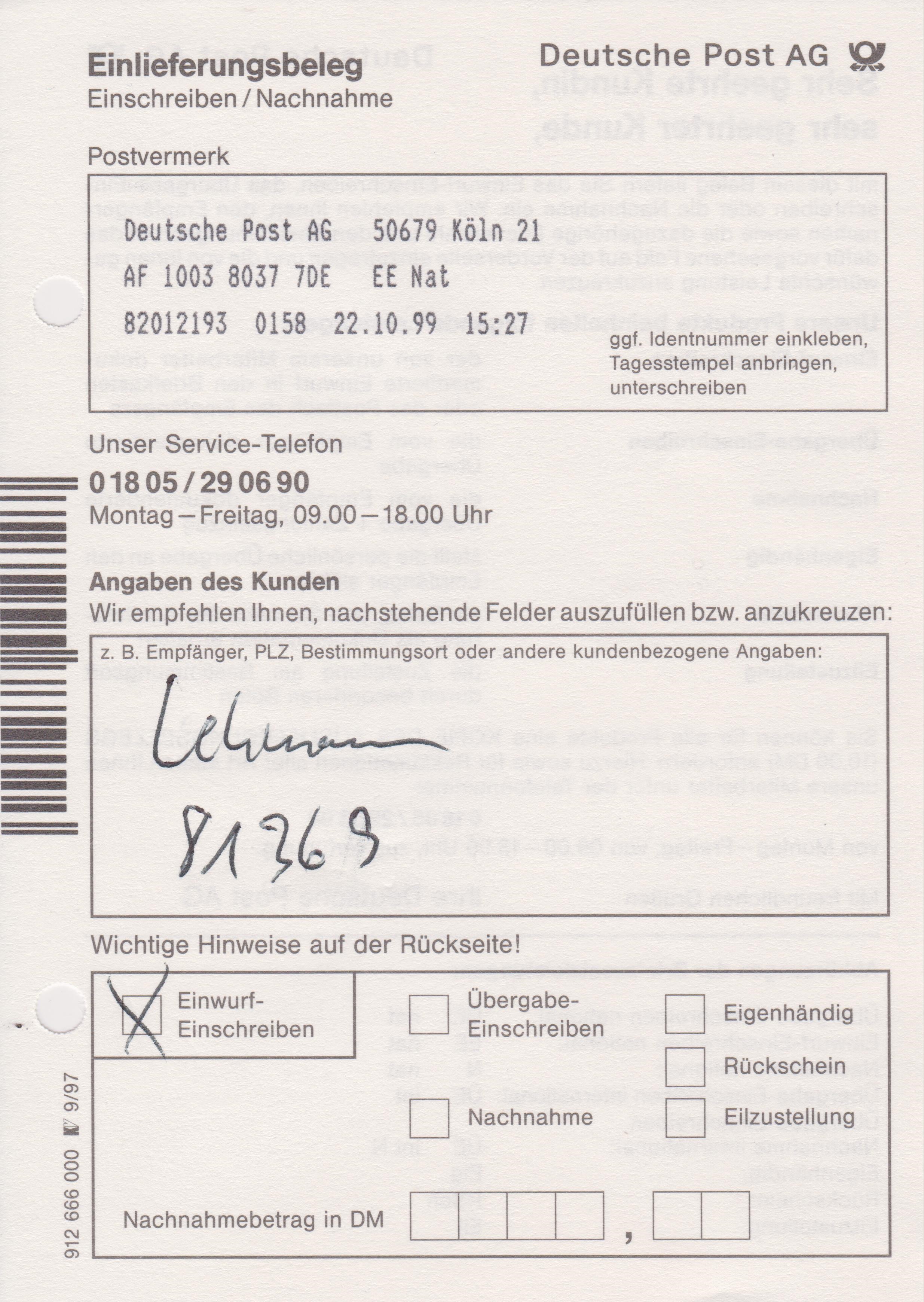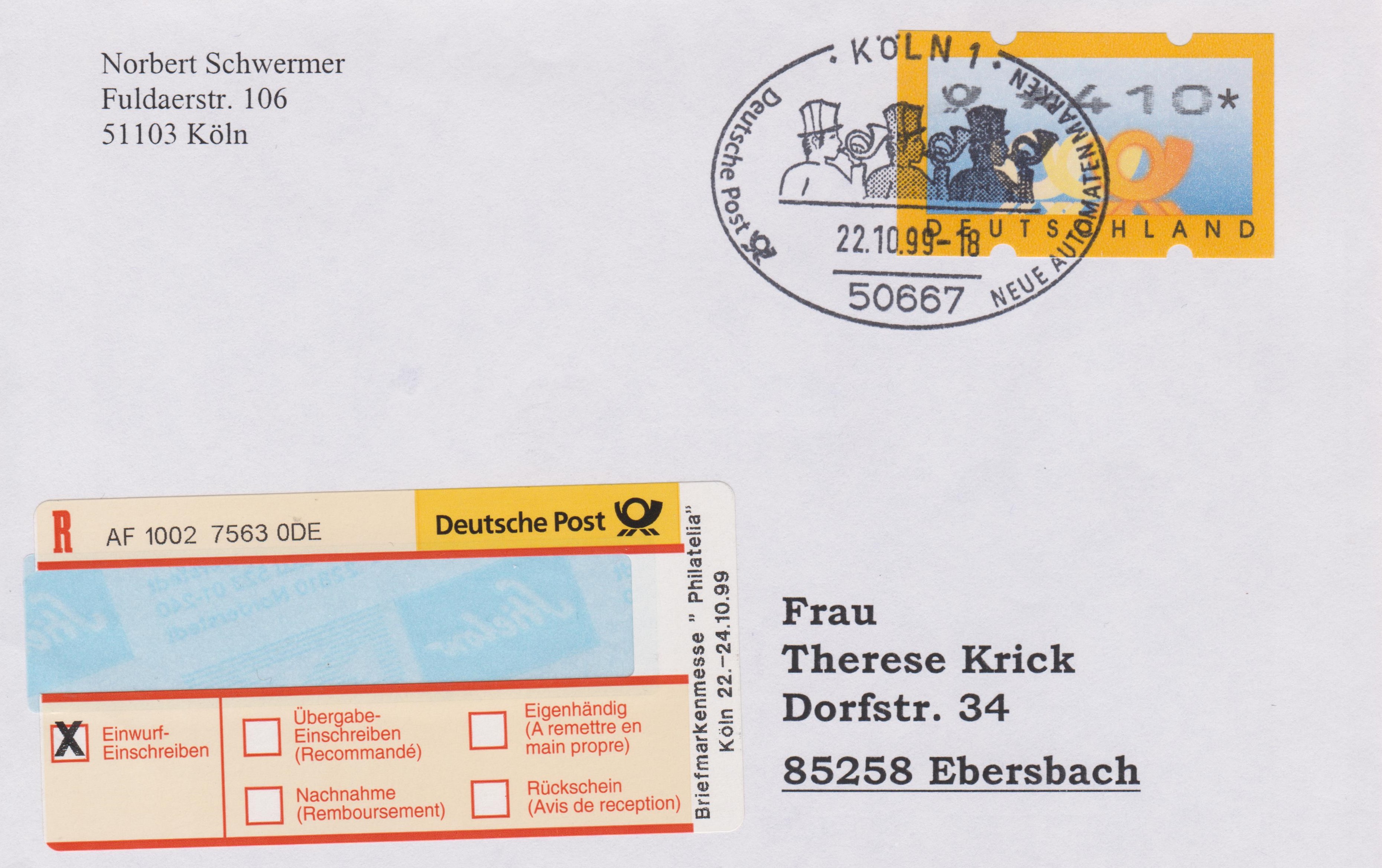 Einlieferungsbeleg vom 22.10.1999 zu einem Einwurf-Einschreiben mit Sonder-Identcode-Label "Viele Grüße von der Briefmarkenmesse in Köln", X-So-38-EE: