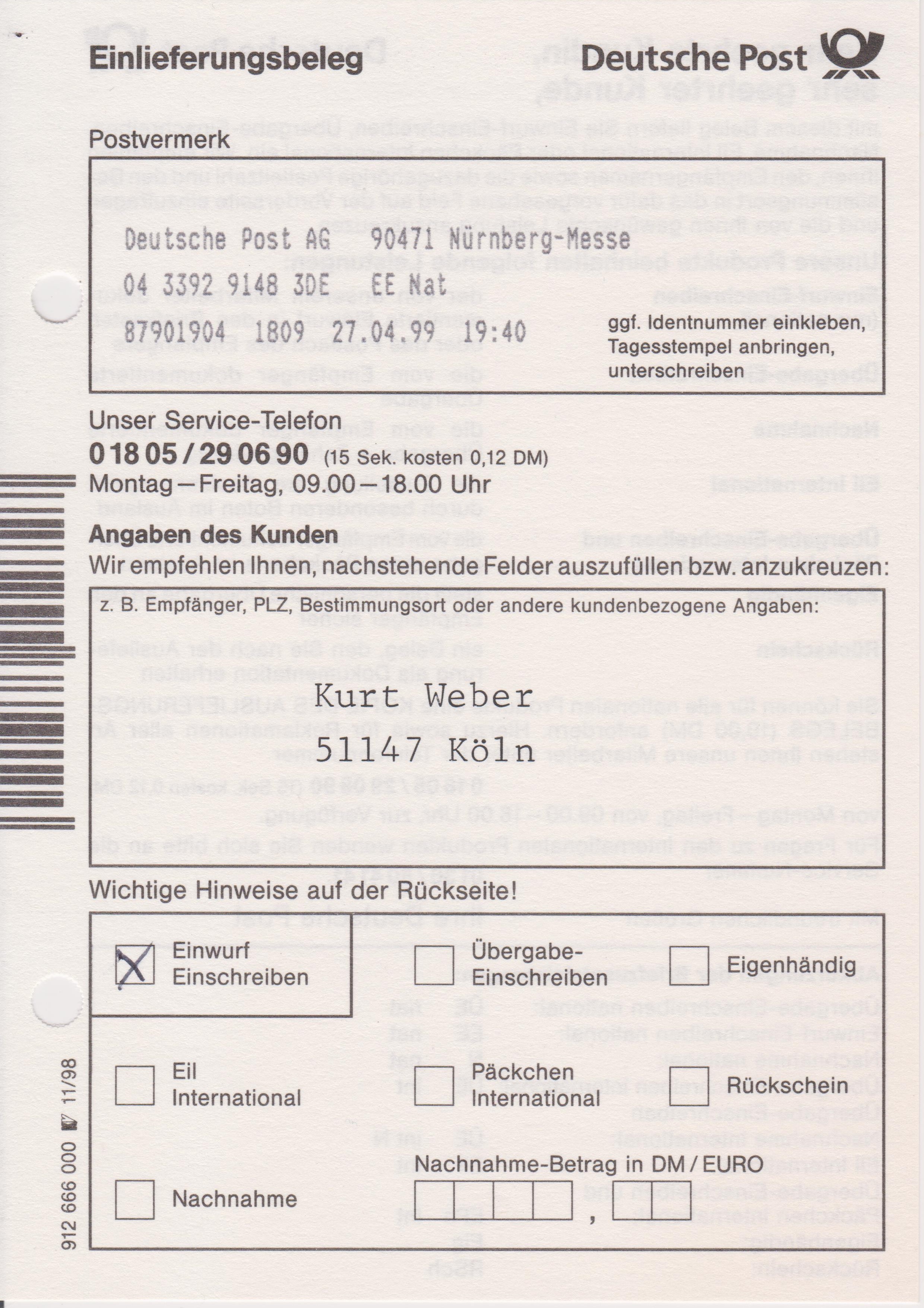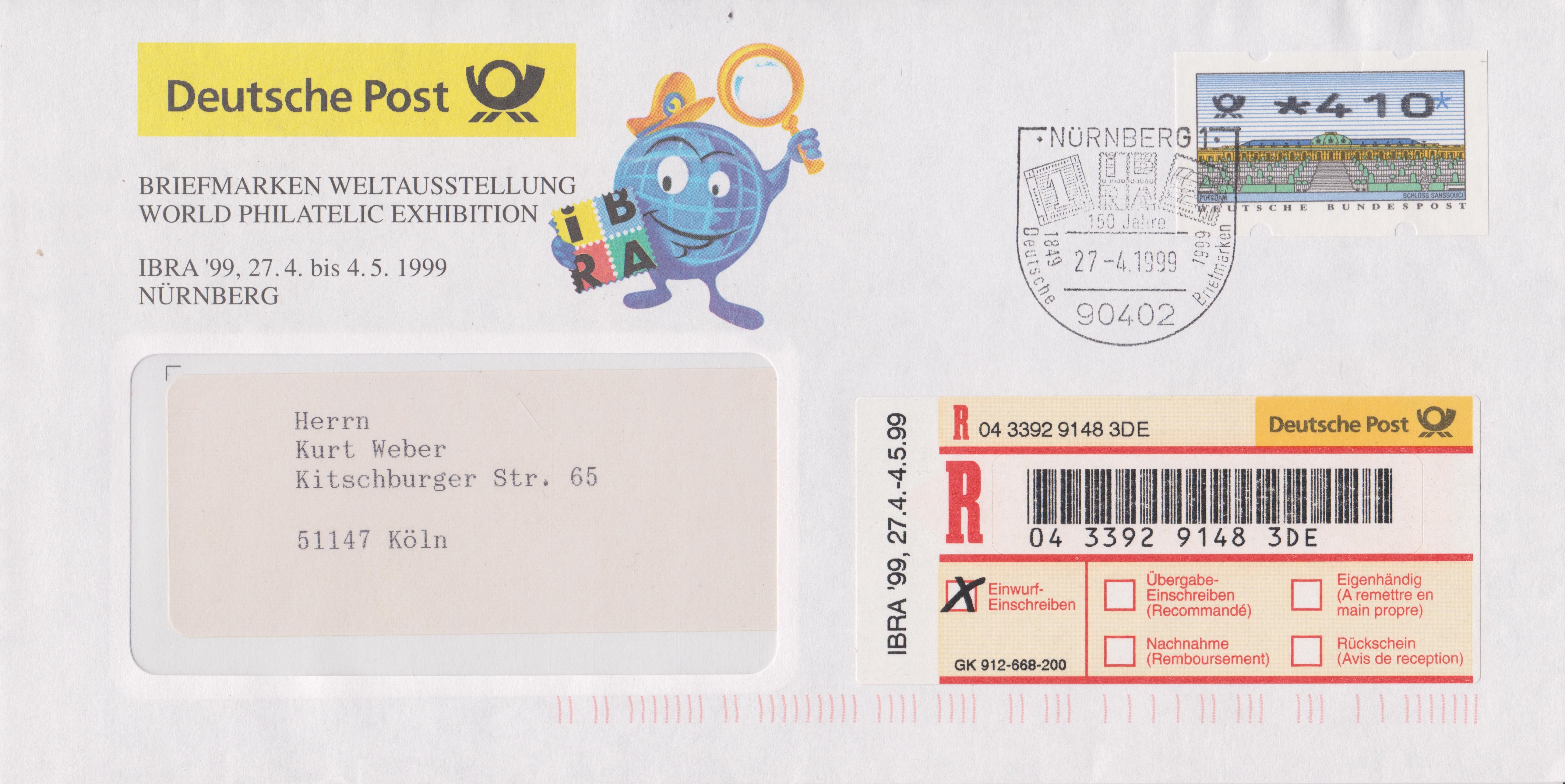 Einlieferungsbeleg vom 27.04.1999 zu einem Einwurf-Einschreiben mit Sonder-Identcode-Label "IBRA ´99, 27.4.-4.5.99", VII-200-So-IBRA-EE: