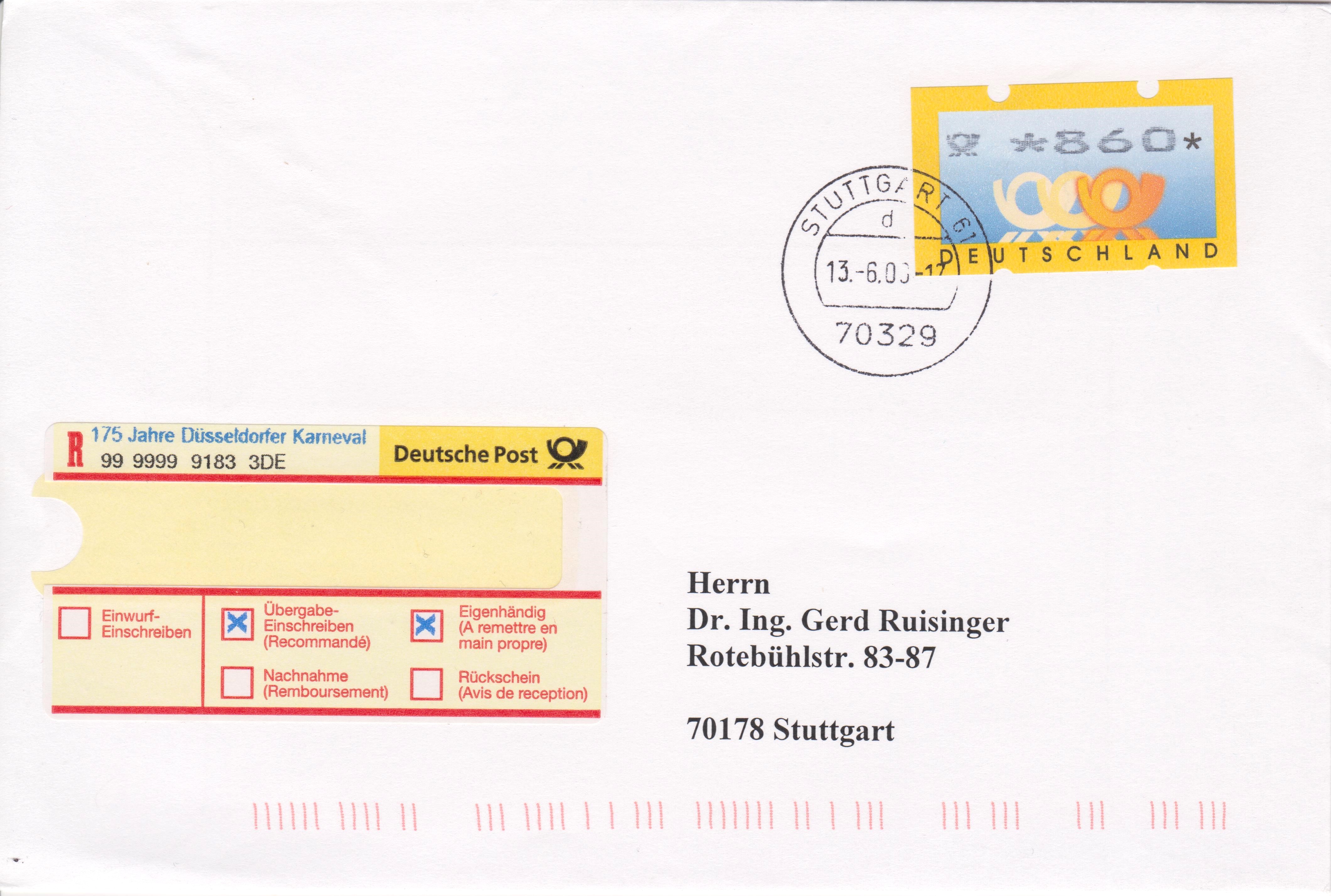 Einlieferungsbeleg vom 13.06.2000 zu einem Einschreiben mit Sonder-Identcode-Label "175 Jahre Düsseldorfer Karneval", XIV-So-3-ÜE: