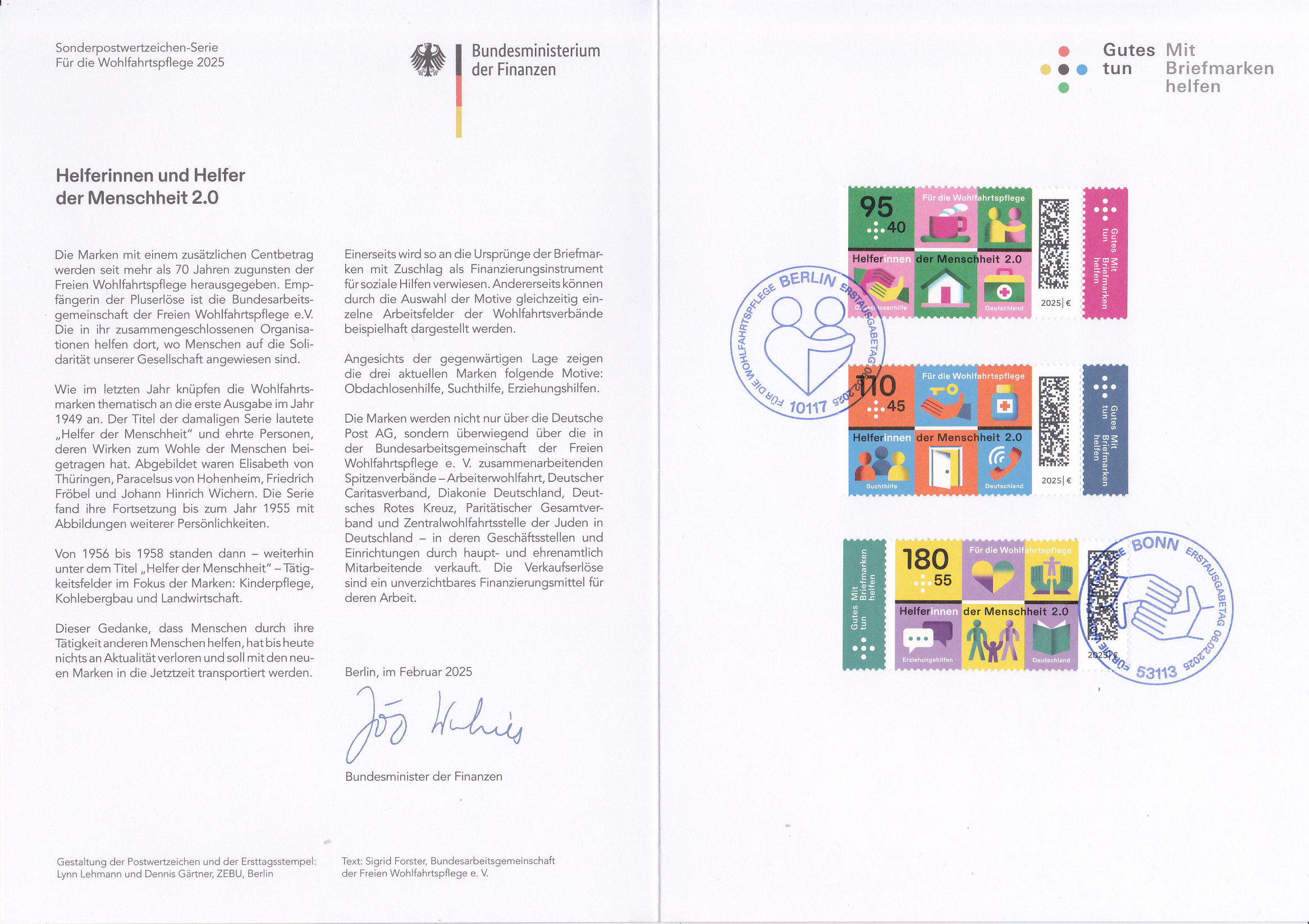 Farbige Ministerkarte des Bundesministers für Finanzen mit je einer Marke der Serie "Für die Wohlfahrt" 2025 (MiNr 3885 bis 3887) mit Motiven zum Thema "Helferinnen und Helfer der Menschheit" und den beiden Ersttagsonderstempel Bonn und Berlin.