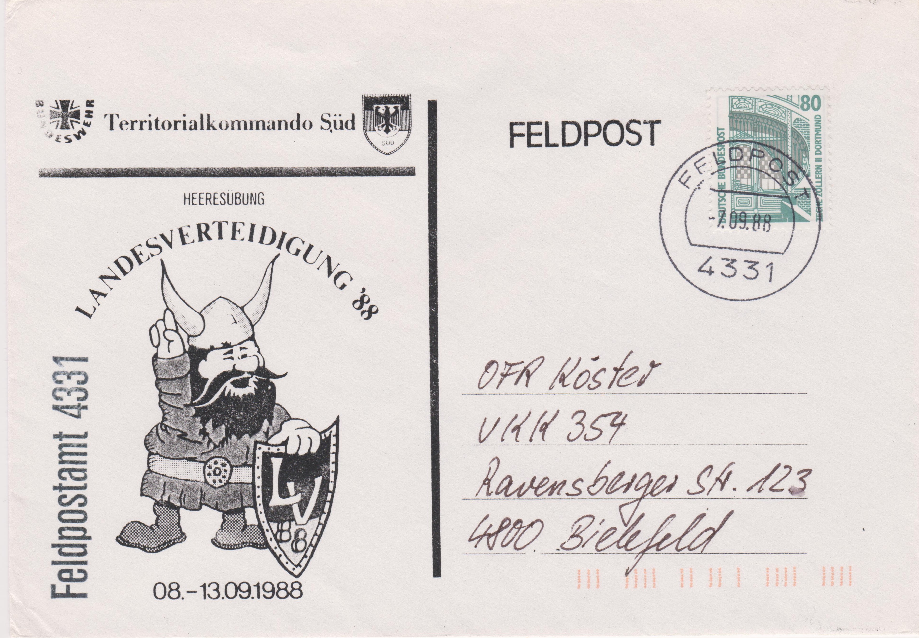 Das Feldpostamt Müllenbach - MatAusgSt Ulmen führte während der Übung "Landesverteidigung 1988" den Stempel FELDPOST 4331, hier am 07.09.1988 abgeschlagen auf einer Postkarte, Portostufe 80 Pfennig: