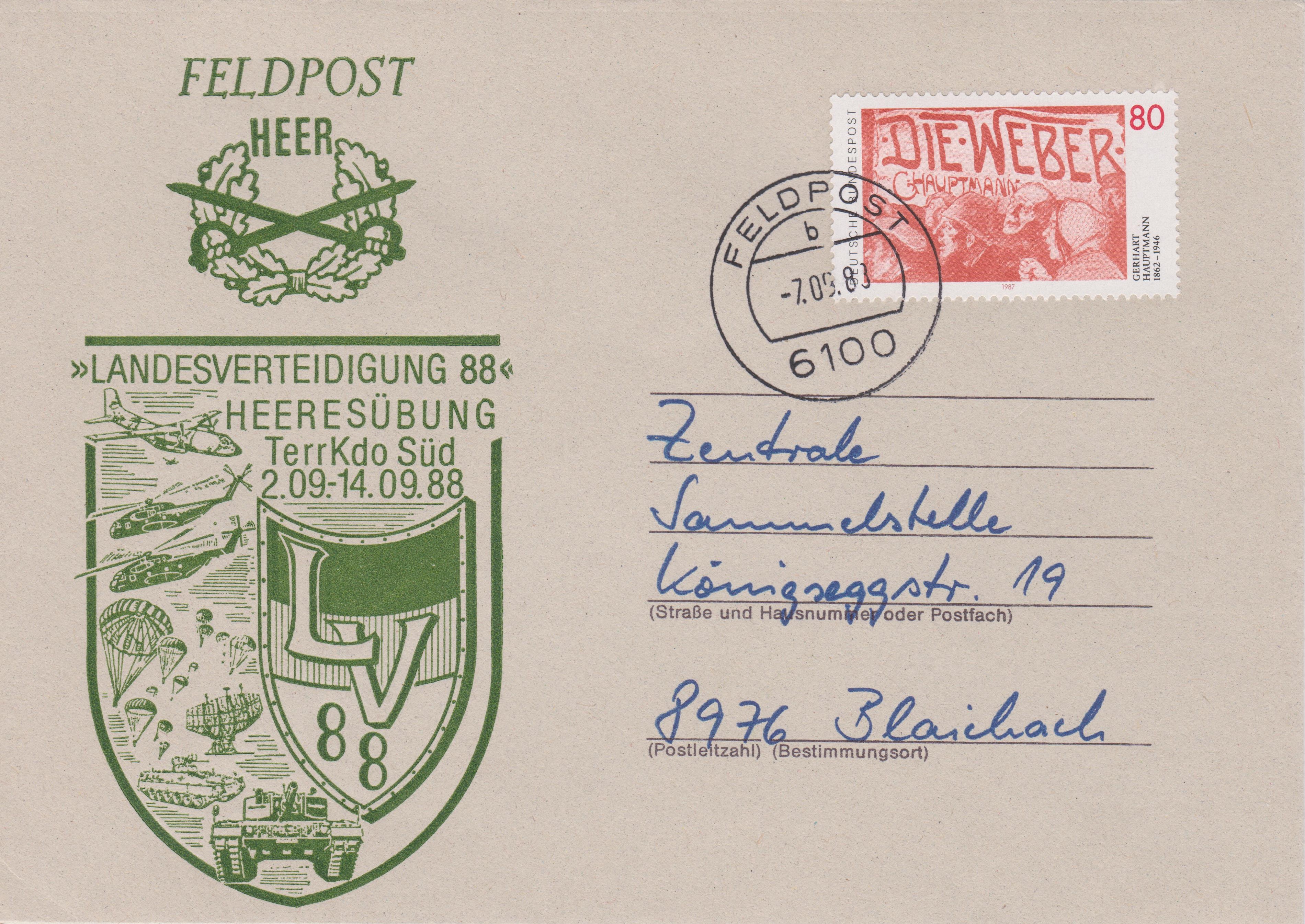 Dieser Beleg wurde am 07.09.1988 während der Übung "LANDESVERTEIDIGUNG 88" aufgegeben bei FELDPOST 6100:
