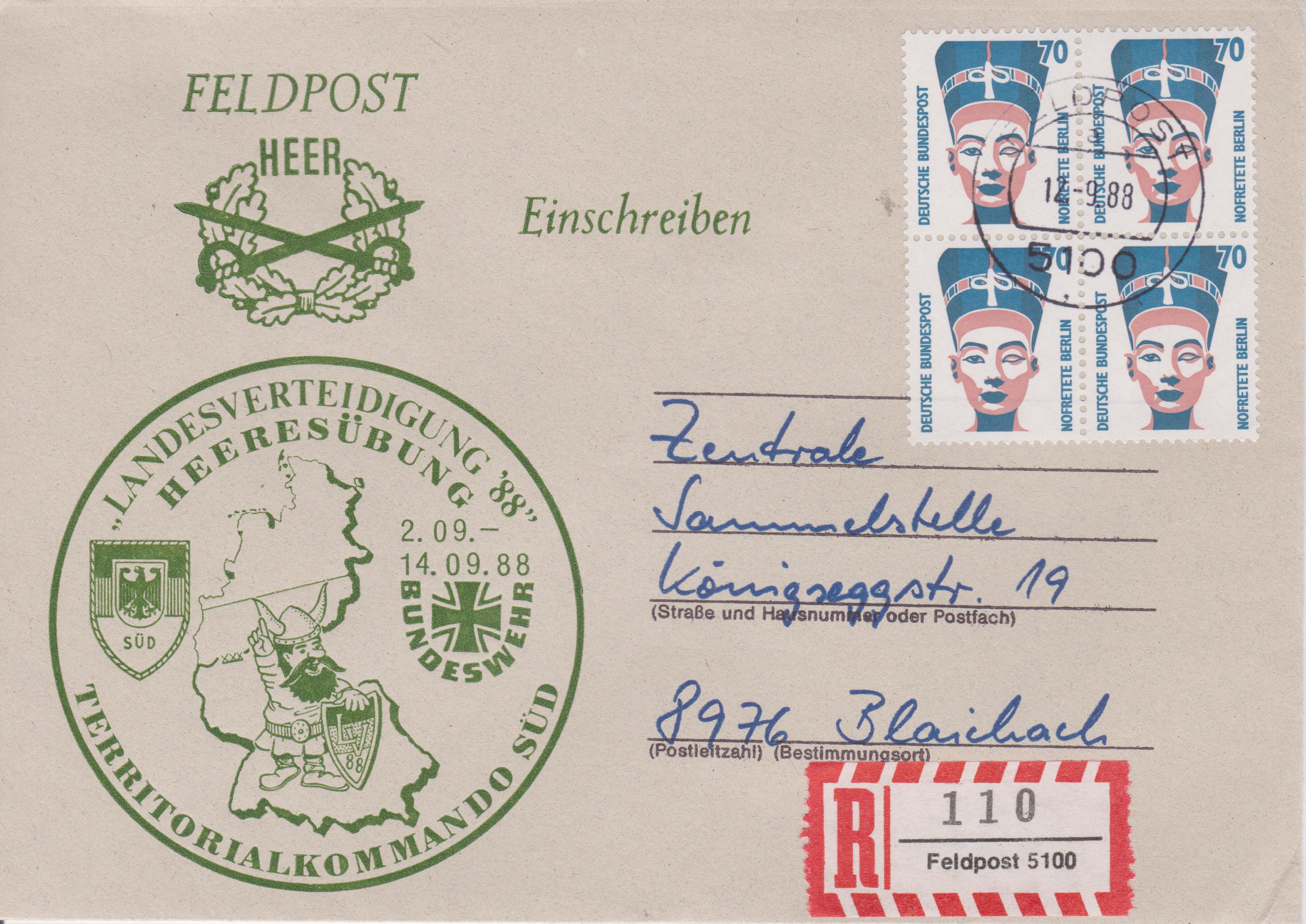 Brief, Porto 80 Pf, per Einschreiben, Porto 200 Pf, ergibt die Portostufe 280 Pf, hier dargestellt per Viererblock 70 Pf Dauerserie Sehenswürdigkeiten am 12.09.1988 ab FELDPOST 5100: