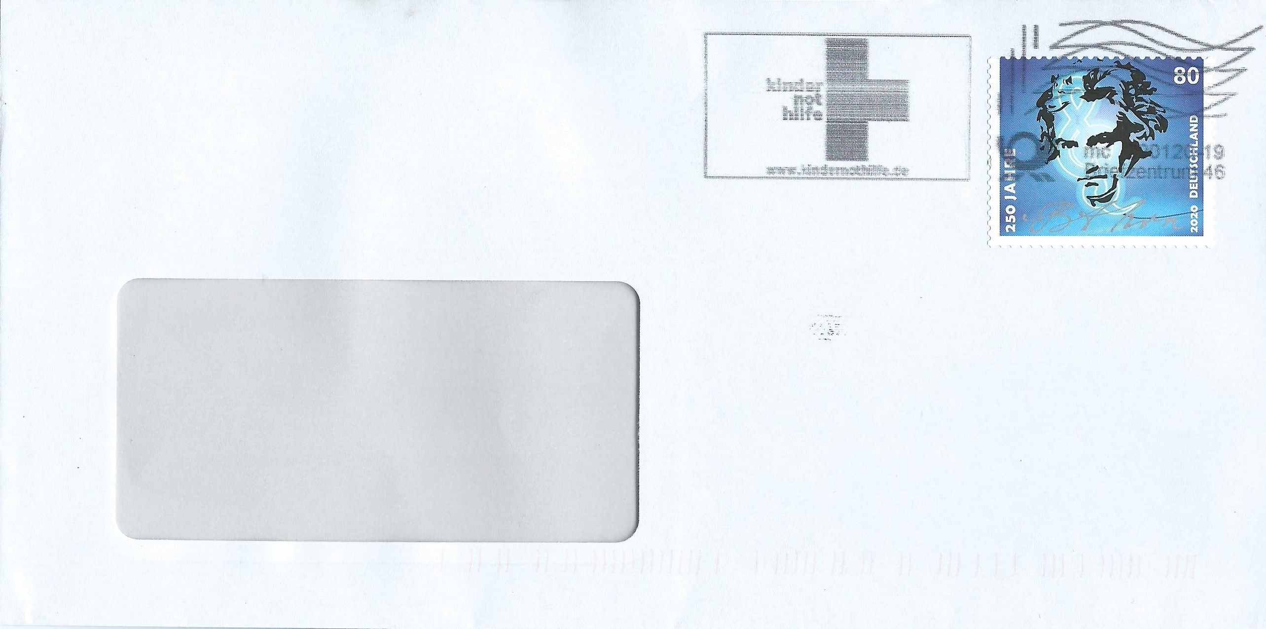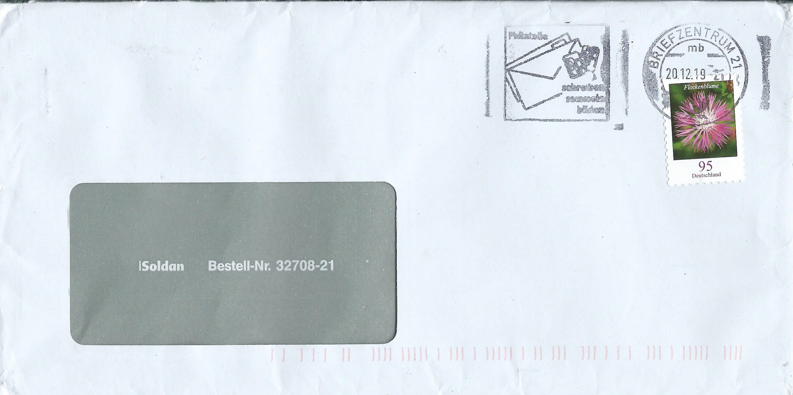 im vorletzten Beitrag hatte ich ja erwähnt, dass im Briefzentrum 21 auch noch die alte Stempelmaschine läuft. Dazu habe ich noch ein Belegexemplar gefunden. Der Stempel datiert vom 20.12.19:
