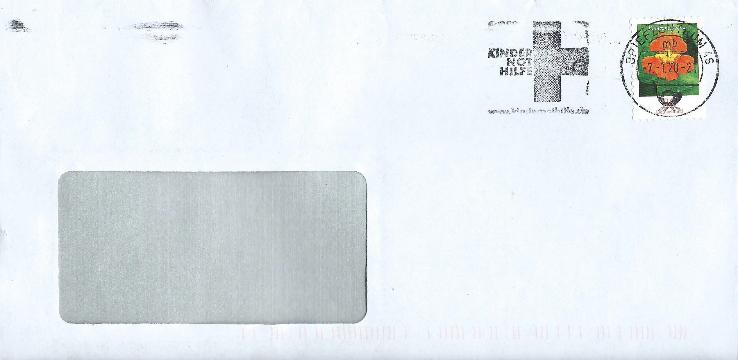 vom Briefzentrum 46 eine neue "Stempel"variante: Der Werbeeinsatz Kindernothilfe ist hier in einem rechteckigem Rahmen aufgedruckt worden. Der Tag lässt sich nicht mehr entziffern, er ist etwas verschmiert auf schwarzem Untergrund gelandet. Man kann nur noch X2.01.20-19 erkennen.
