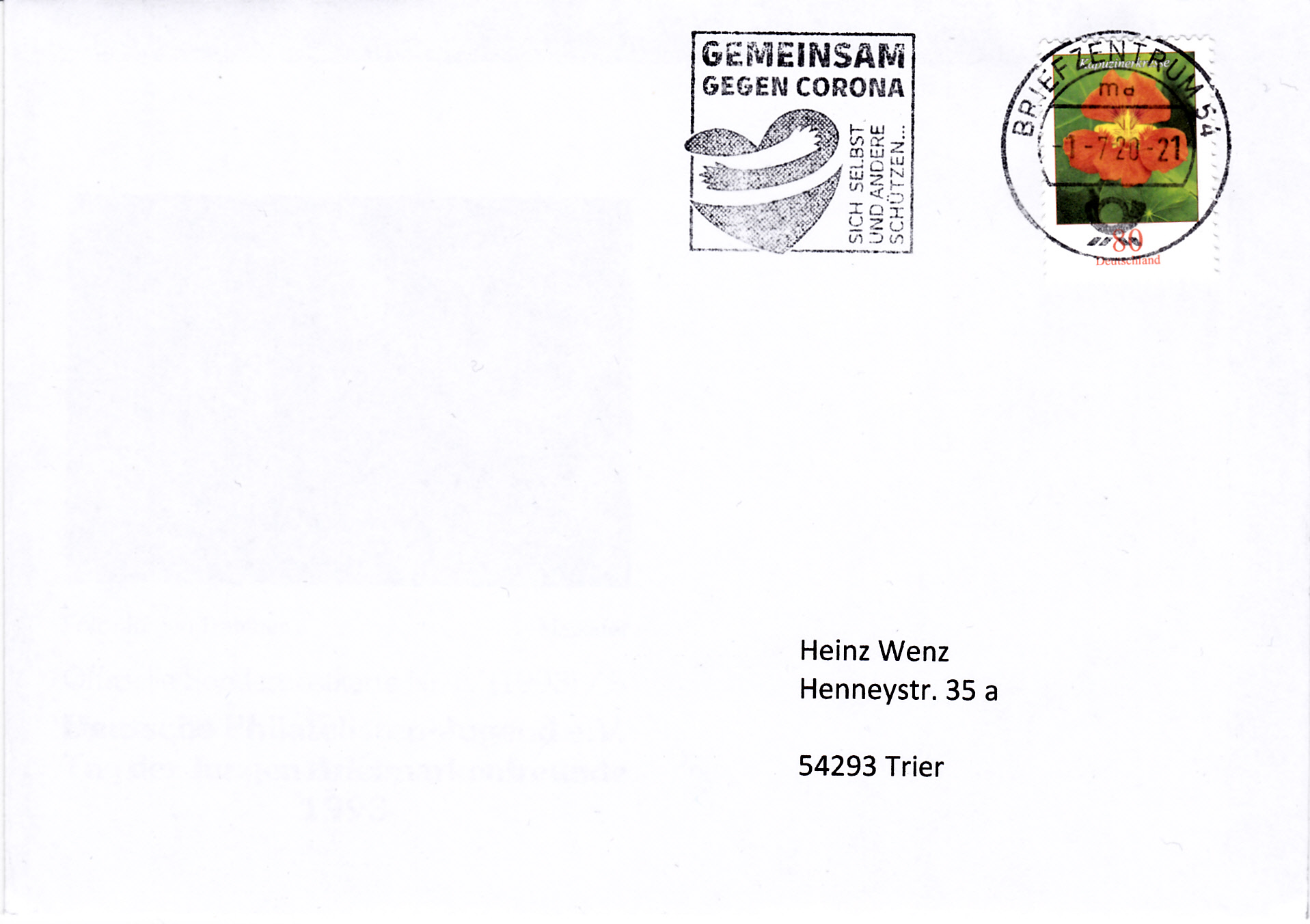 hier ein weiterer Eingang vom Briefzentrum 46 mit der neuen Entwertung am 20.2.20. Als Frankatur dient eine selbstklebende Blumenmarke zu 95 Cent.