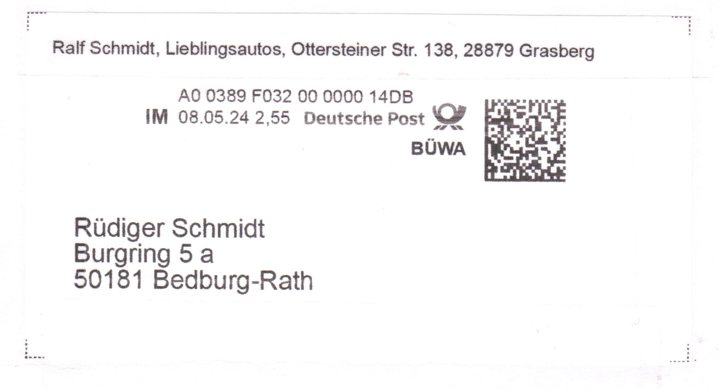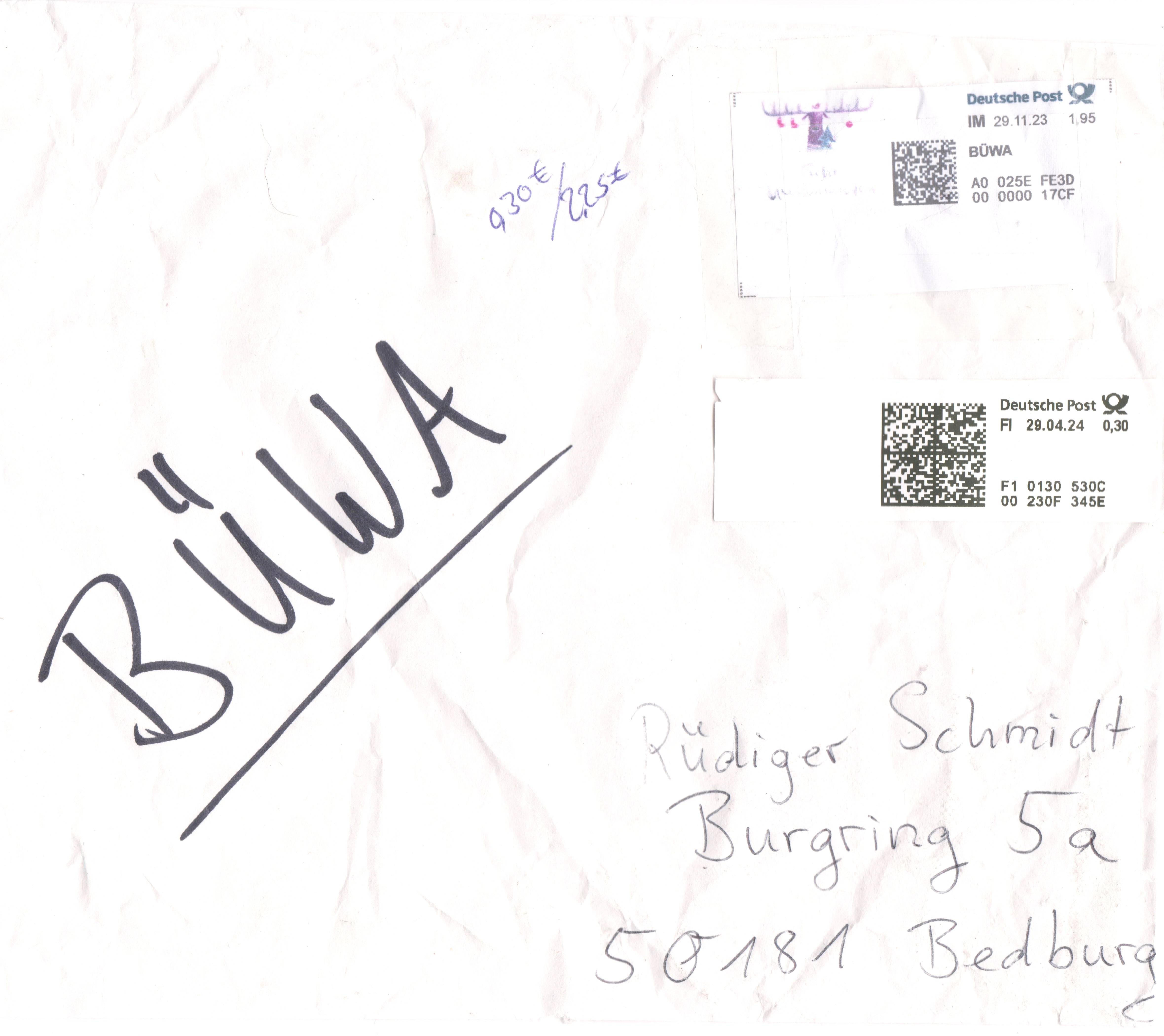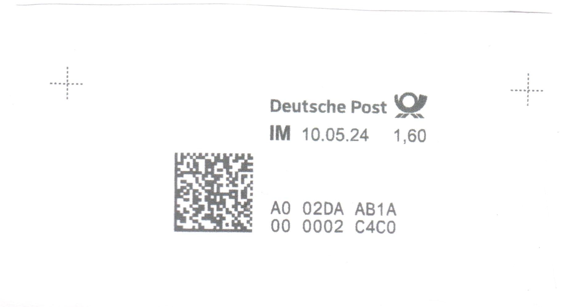 Bei diesem Beleg wurde eine ausgedruckte Internetmarke = IM vom 20.01.2023, Wertstufe "1,95", erst im April 2024 für eine "BÜWA" = Bücher- und Warensendung, Portostufe 2,25 €, verwendet: