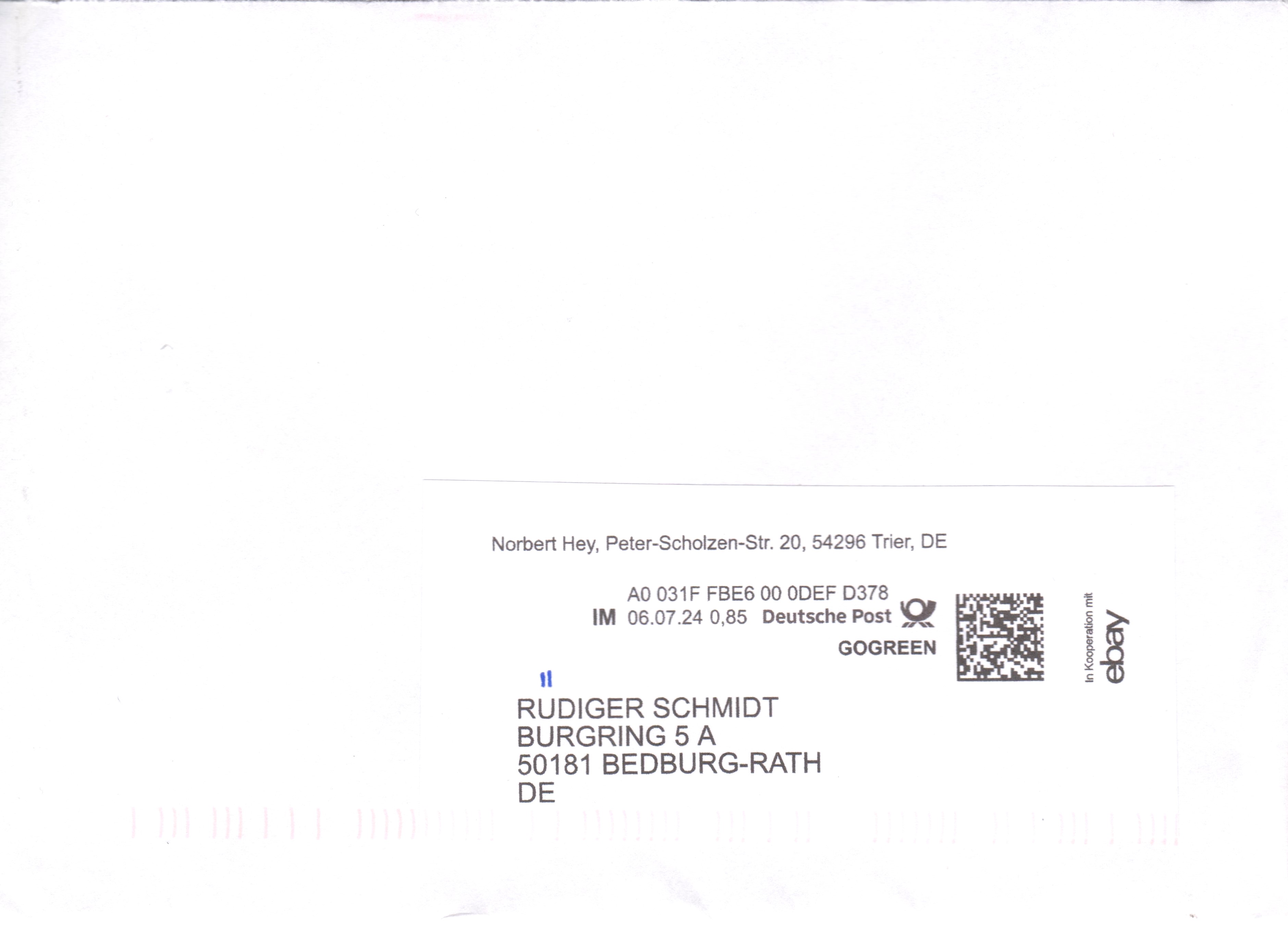 Internetmarke = "IM" am 06.07.2024 auf Brief = Portostufe 0,85 € mit Zusatz GOGREEN: